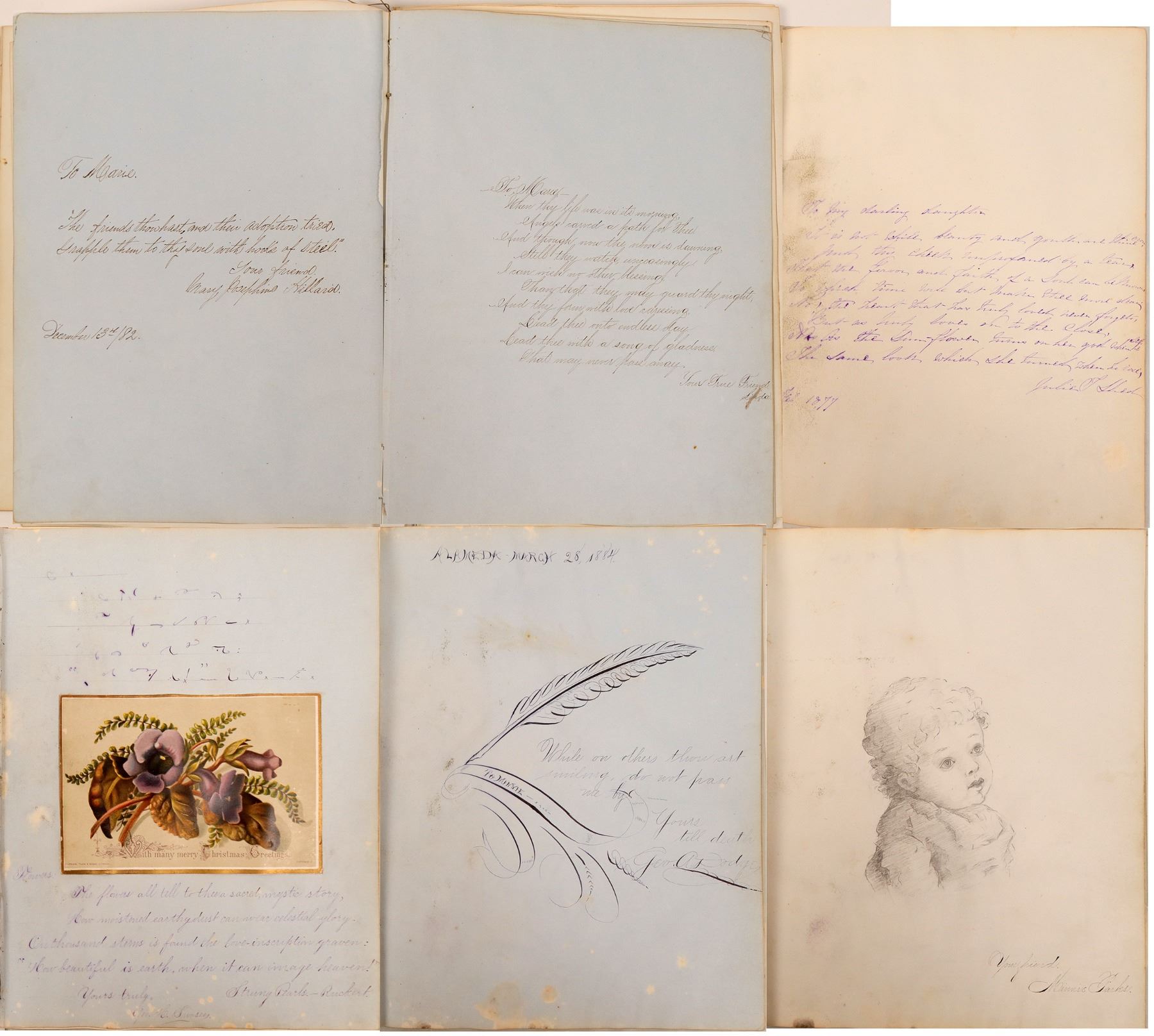 Fascinating Parlor Book owned by Marie (Minnie) S. Shed. Marie was the daughter of Charles and Julia Shed. The parlor book includes pages of artworks, poems, notes (some in French). Poems by Annie Nahl, Alieta Brittan Shed Marie?s sister), George Swasey (son of Charles Swasey). Lizzie Crocker; note from John Muir; and paintings by Minnie Park (Possibly Minnie Ella Hubbard Parks) who was born in New York on June 26, 1871, and studied in San Francisco at the School of Design in 1893 and exhibited with the local art association); flower paintings by C. H. Williams, 1883; J. Bennet's drawing of a farmer; a watercolor by K. M. Herbert. City: Alameda State: California. A charming book from the 1870-90's of poems, writings and artworks from friends and family of Marie Shed. These are beautifully written in script in sentiments so sincere. Unfortunately the has been some water damage and mold on several pages. Still a very worthwhile item for collectors.( 10" x 8.5", originally bound, but loose pages now).