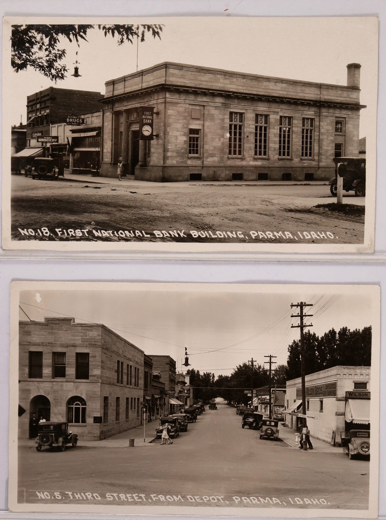 White border: No 5. Third Street, From Depot, Parma, Idaho; No. 18 First National Bank Building, Parma, Idaho.