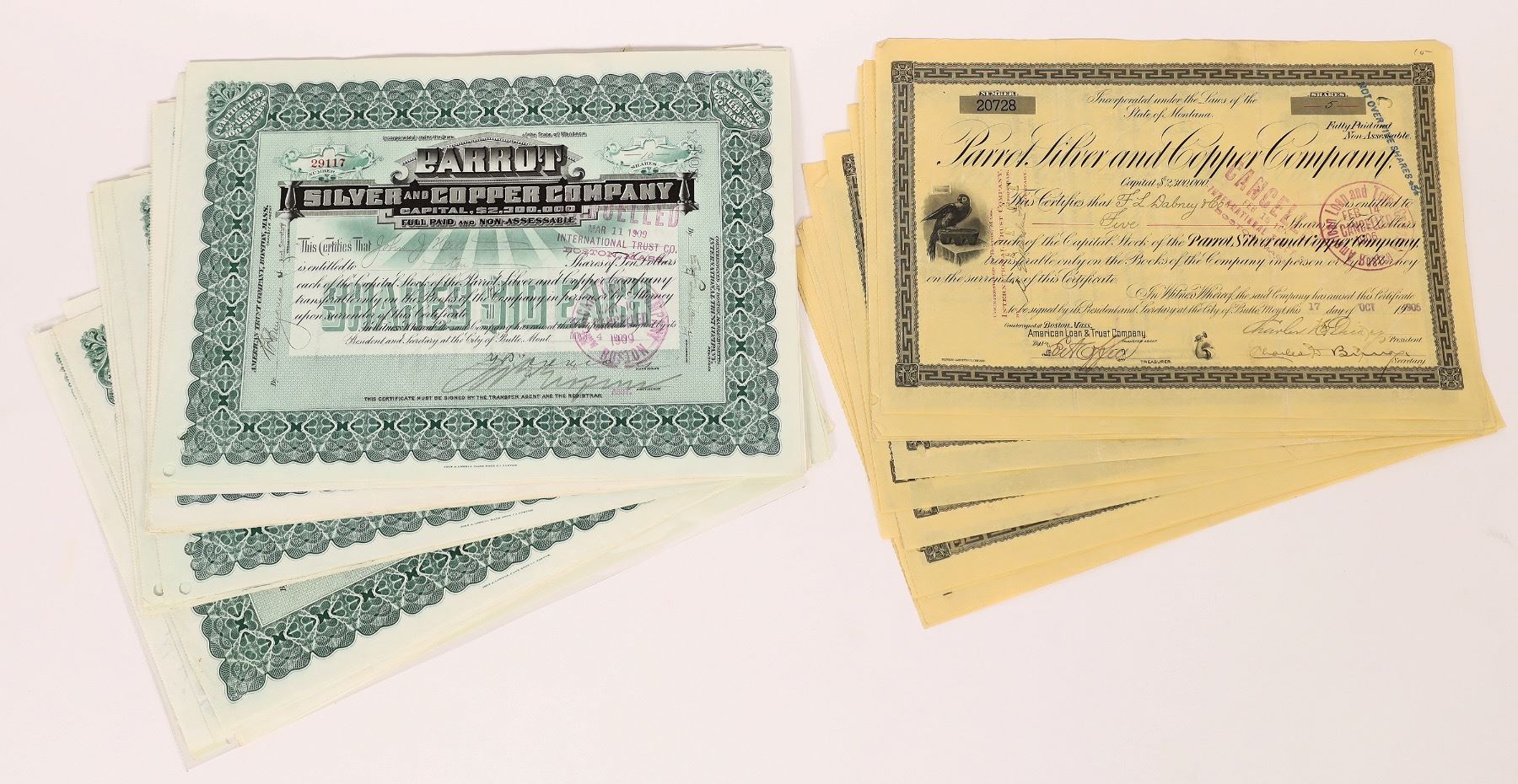 Lot of almost 50 issued stocks, 2 varieties. 1) Thirteen stocks, 1905-06, with black print on yellow background and parrot on copper ingot vignette. All punch and stamp cancelled. 2) Thirty-six stocks issued 1906-10. Green border, black print, no vignette. Stamp and punch cancelled. One of the oldest mining properties on Butte Mountain. Eventually sold to Anaconda.