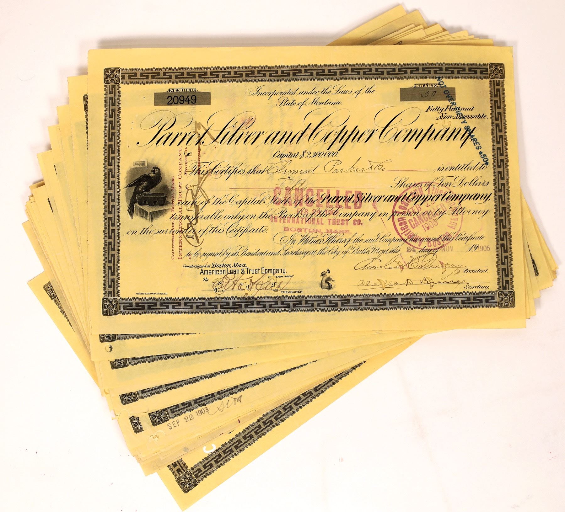 Lot of approx. 50 stocks, issued 1901-1905. All are identical design: black print on yellow background with parrot on copper ingot vignette. All punch and stamp cancelled. One of the oldest mining properties on Butte Mountain. Eventually sold to Anaconda.