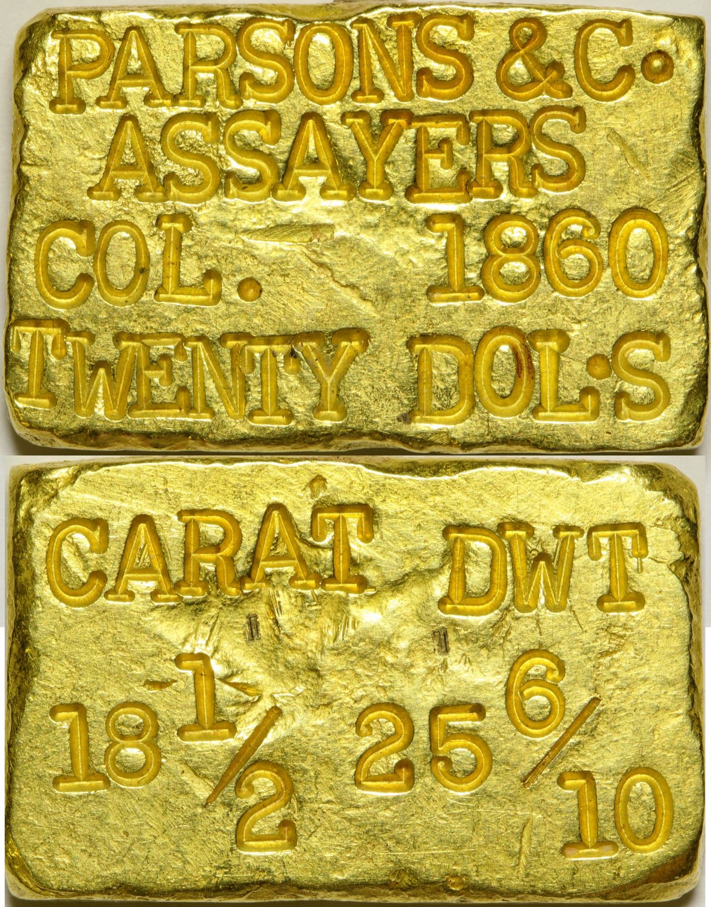Parsons Gold Ingot: "Parsons & Co. / Assayers/ Col. - 1860/ Twenty Dolls// CARAT DWT/ 18 1/2 25 6/10" rectangular, 1.2 x 0.75". 1.26 Troy Ozs.