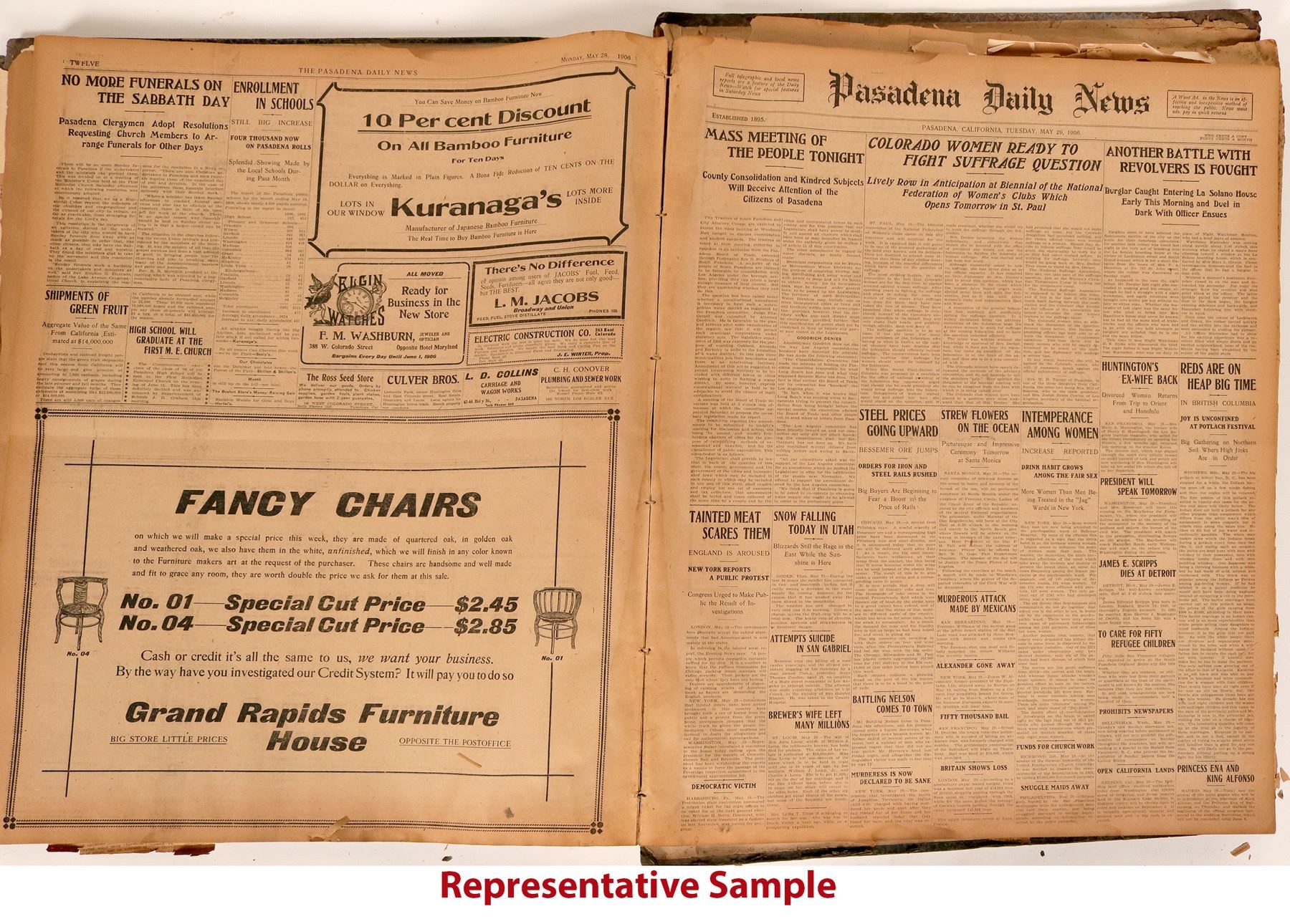 Twenty bound volumes of newspapers from the Pasadena Daily Star, Daily Evening Star, and the Daily News with dates ranging from 1888-1906. This is a great archive of information for the research historian or anyone interested in Pasadena history. The city of Pasadena, California incorporated on June 19, 1986, becoming one of the first cities to incorporate in Los Angeles County. The city is known for the Rose Bowl football game and the Tournament of Roses Parade. The bulk of these bound volumes range from 1888- 1897, which makes them invaluable for research into the early days of Pasadena.