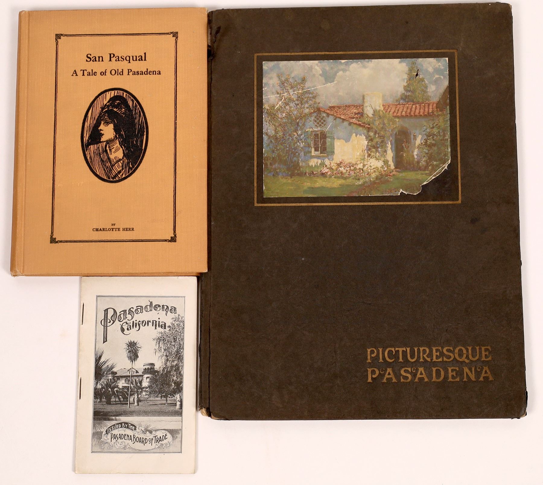 Lot of 3 publications about various historical aspects of Pasadena, CA. Collection consists (1) hardbound book titled Picturesque Pasadena, by Pasadena Chamber of Commerce & Civic Association, nd, c. 1920s, 55 pp of sepia-toned photographs, stamped cover w/illustration, tears in spine but binding intact, no torn pages, good condition; (2) hardbound book titled San Pasqual: A Tale of Old Pasadena, by Charlotte Herr, 1926, 120pp, no illustrations, signed w/initials w/date 1937; and (3) a small paper booklet simply titled Pasadena California, by the Pasadena Board of Trade, 1902, 40pp. State:California City:Pasadena Date: Provenance: