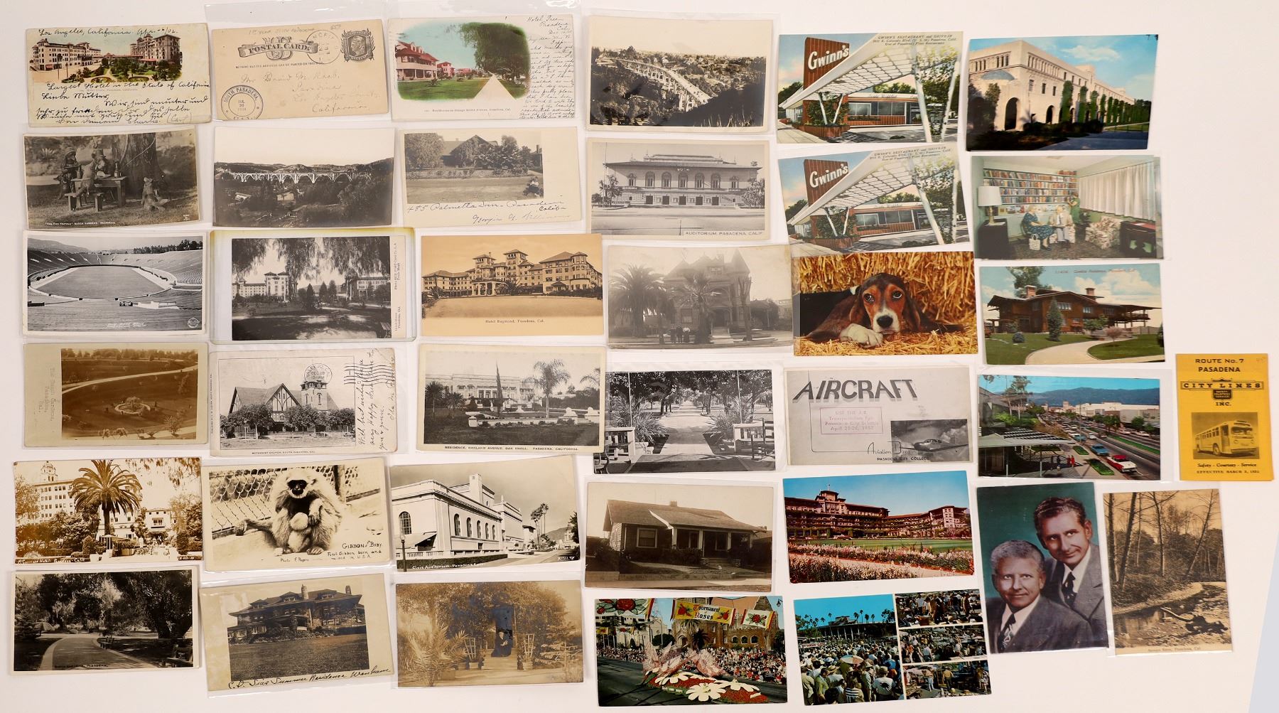 Collection, including 21 RPCs and 2 Private Mailing Cards postmarked 1902, depict various scenes throughout early 20th century Pasadena including buildings, roads, bridges, gardens, parks, and the Arroyo Seco greenbelt/seasonal river. Of special interest is a very rare 1st Year South Pasadena postal card dated and postmarked July 23, 1884.