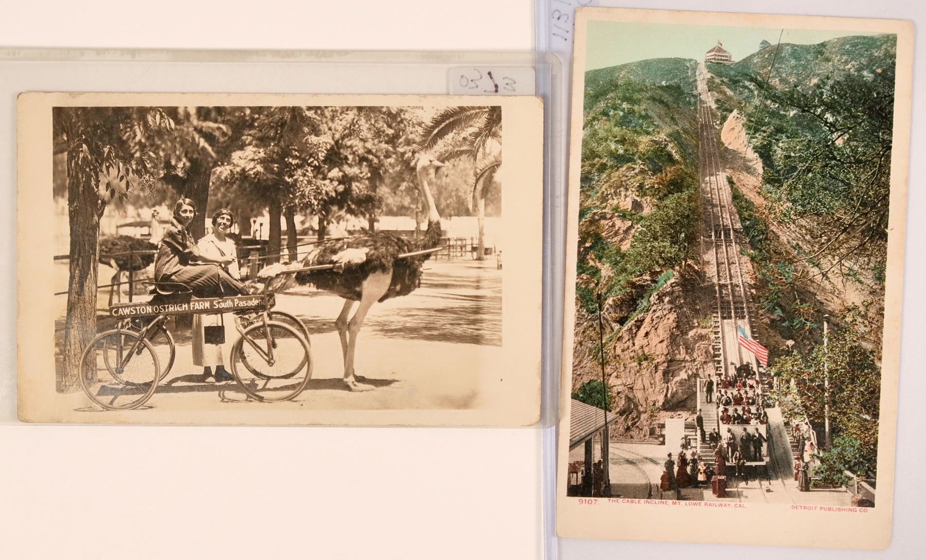 Set of two Pasadena area RPCs; black and white ; unused , rounded corners, with white border ; Street scend of a Ostrich drawn buggy with two women riding the wheeled wagon that is marked" Cawston Ostrich Farm" South Pasadena; Palm trees, pond, park area of the farm, the Ostrich head must stand 8 feet high, towers high above the female rider's heads; judging from the attire, it appears to be in the 1920s/
