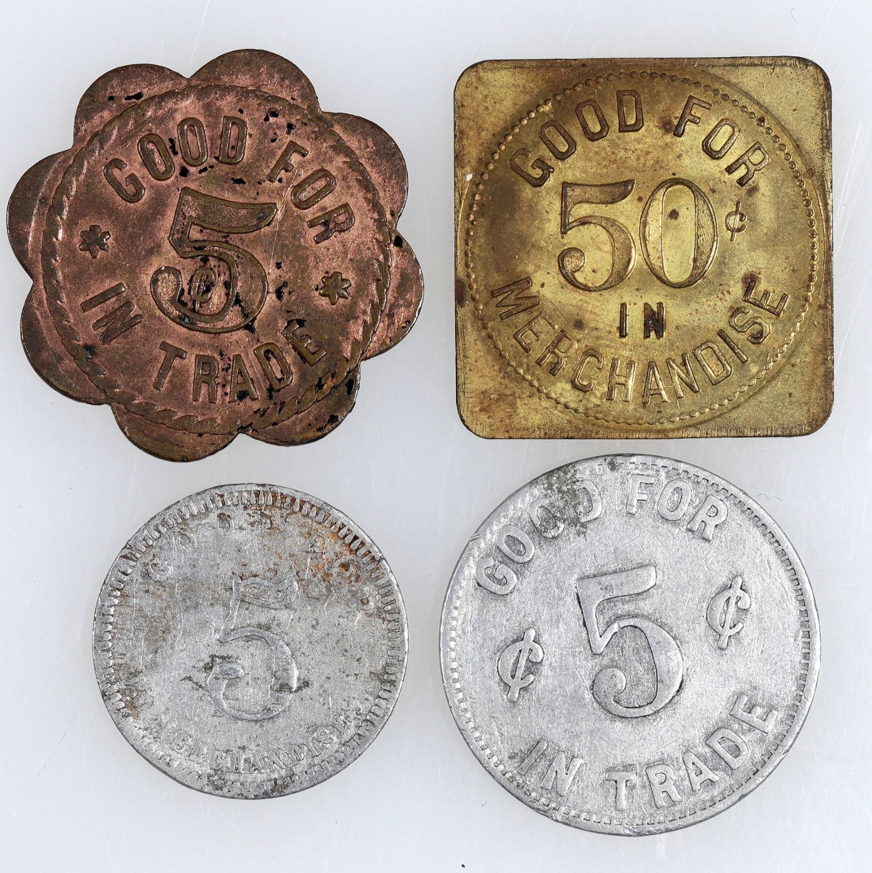 Lot of four tokens from the San Luis Obispo County town of Paso Robles: Mac & Gabe; Geo. R. Nuckolls; Geo. F. Bell; Johnny's Cocktail Lounge. Paso Robles California