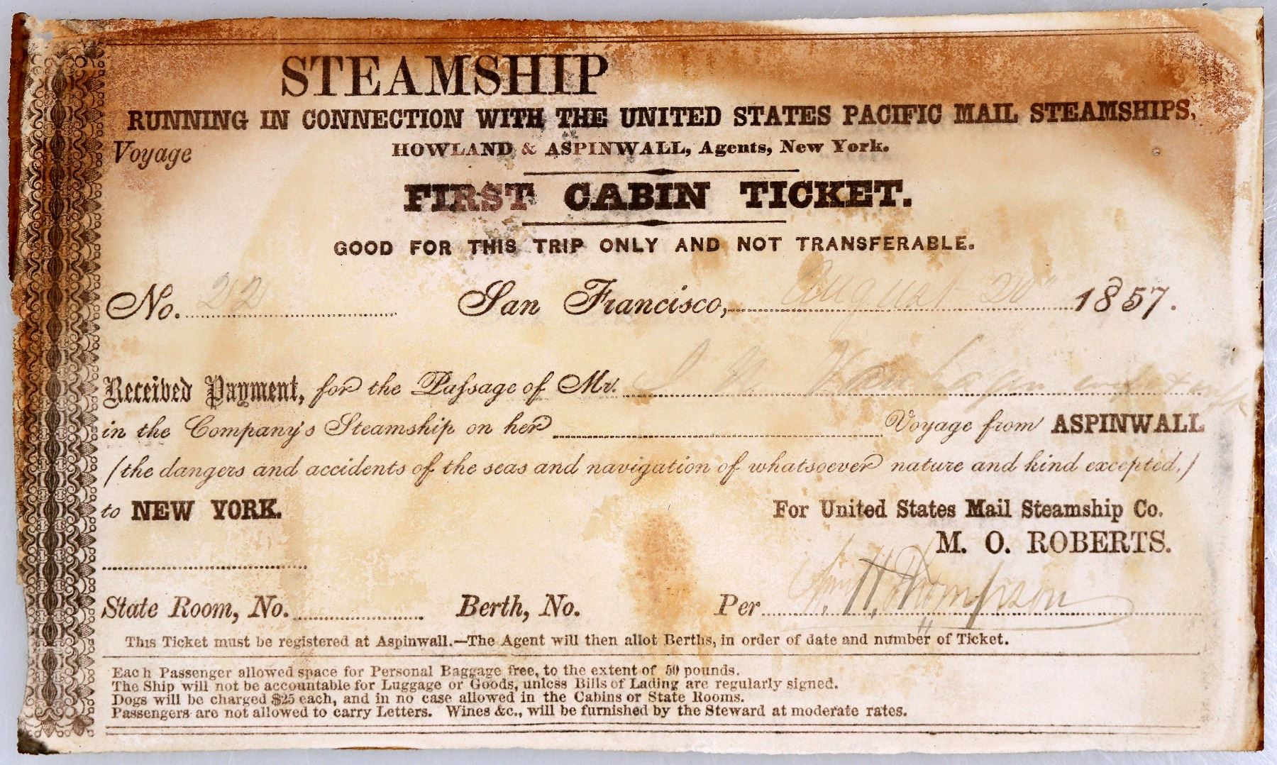 San Francisco to New York passenger receipt for Van Hagen and wife. Van Hagen's wife and daughter "California" were saved on the Marine. Van Hagen may have been an early miner in California, as he named his daughter California. The family was reportedly from Binghamton.