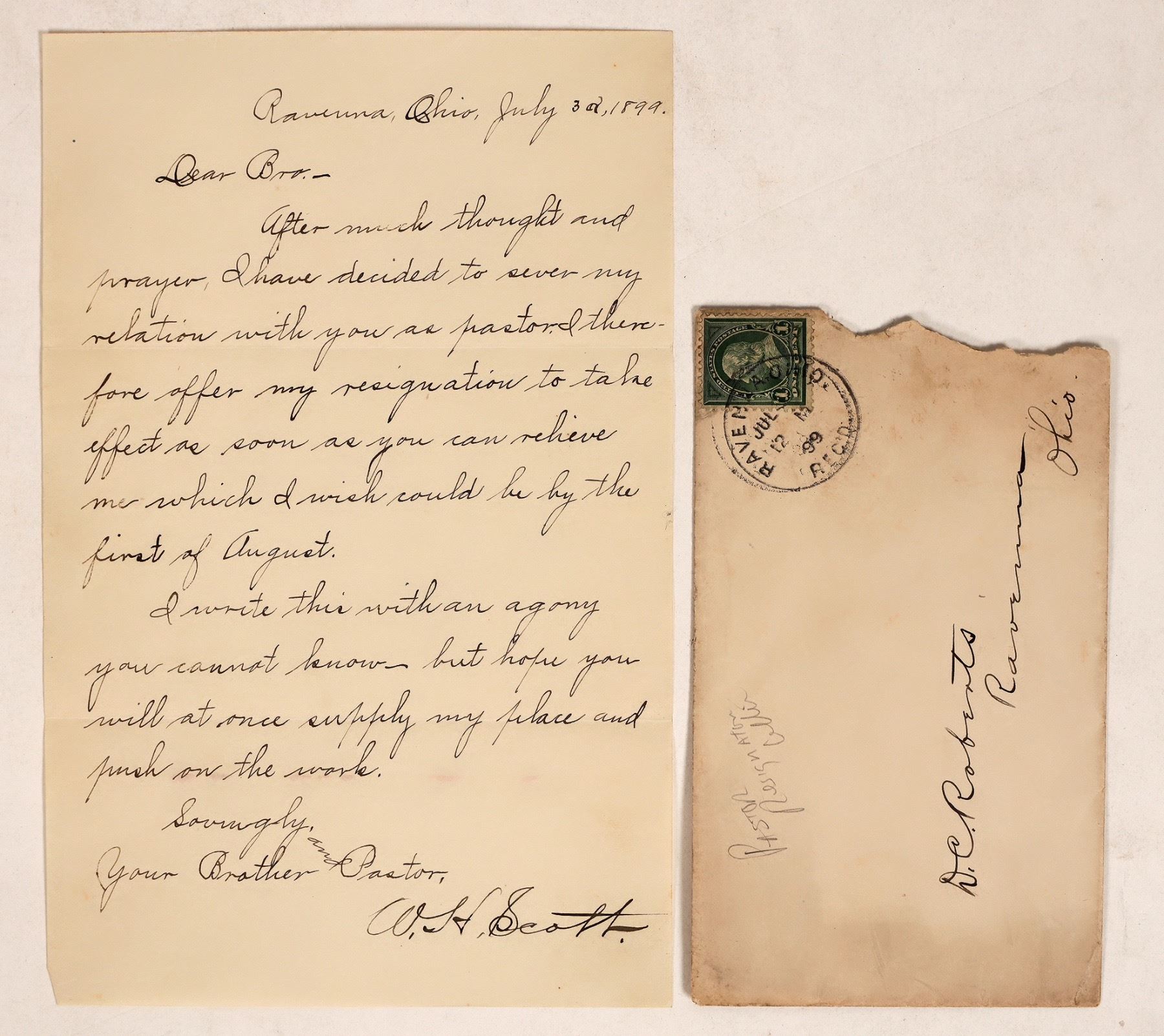 Rather incredible letter to sever relations from Pastor W.H. Scott to Paster W.C. Roberts, breaking off a relationship between them. Relationship/grievance is unclear. Circa 1899.[ Ohio
