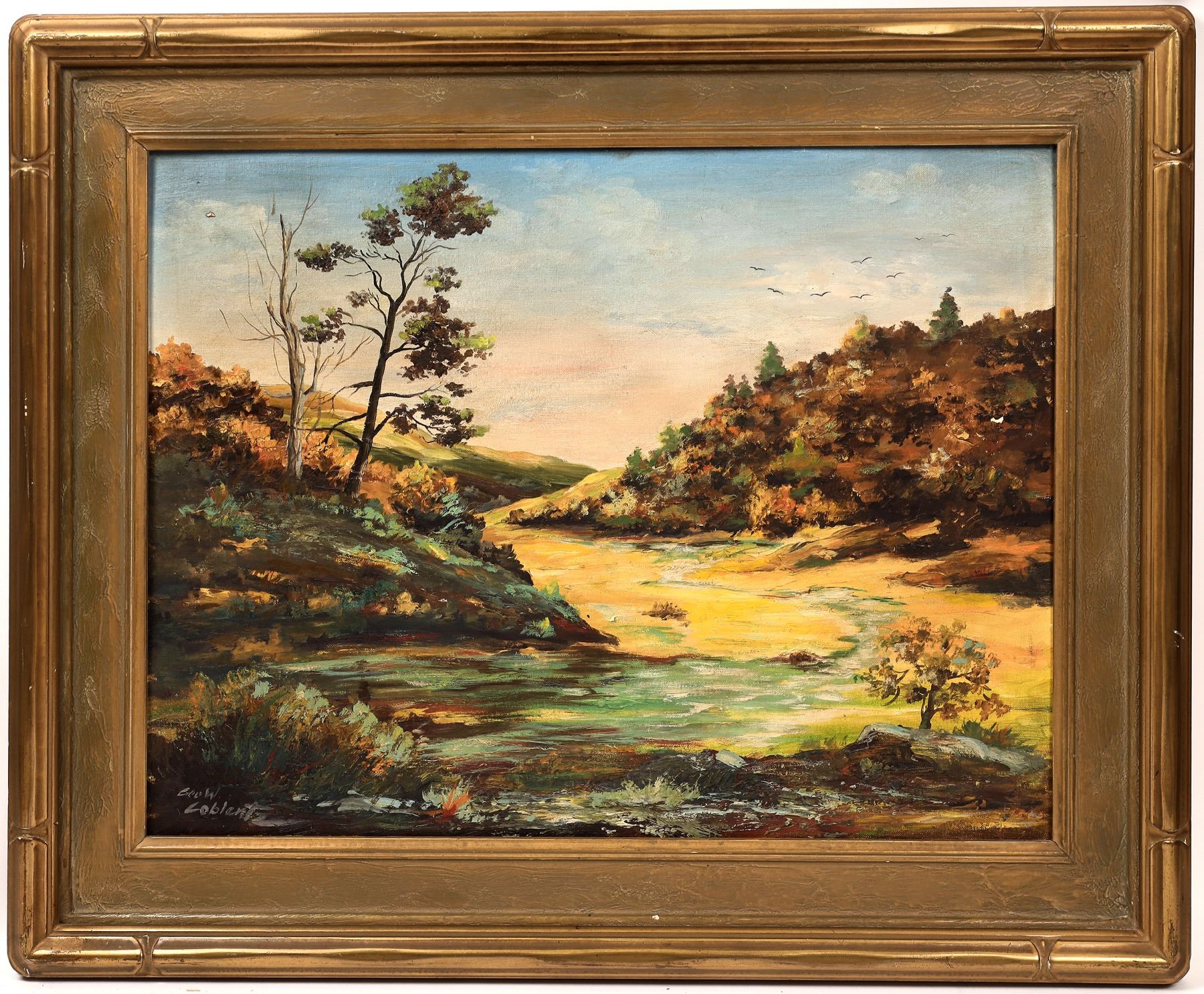 Painting: Original Oil in a classic, Circa 1910-1915 gilt frame. Image: 23.5 x 17.5". Frame: 31 x 24.5". On the back in pencil is the word "Pasture", by Coblentz, 5736 5th Ave, Los Angeles, 43". Signed in lower left, Geo. W. Coblentz. Coblentz, 1896-1973 was an accomplished Southern California Artist. According to Falk, Volume 1, page 675, he began as a topographical mapper during WW1, became a Cartoonist for the L.A. Herald in the 1920's, then worked in the Art Dept of several movies, including designing technical art for Hughes Aircraft. His paintings have been exhibited throughout the West. California