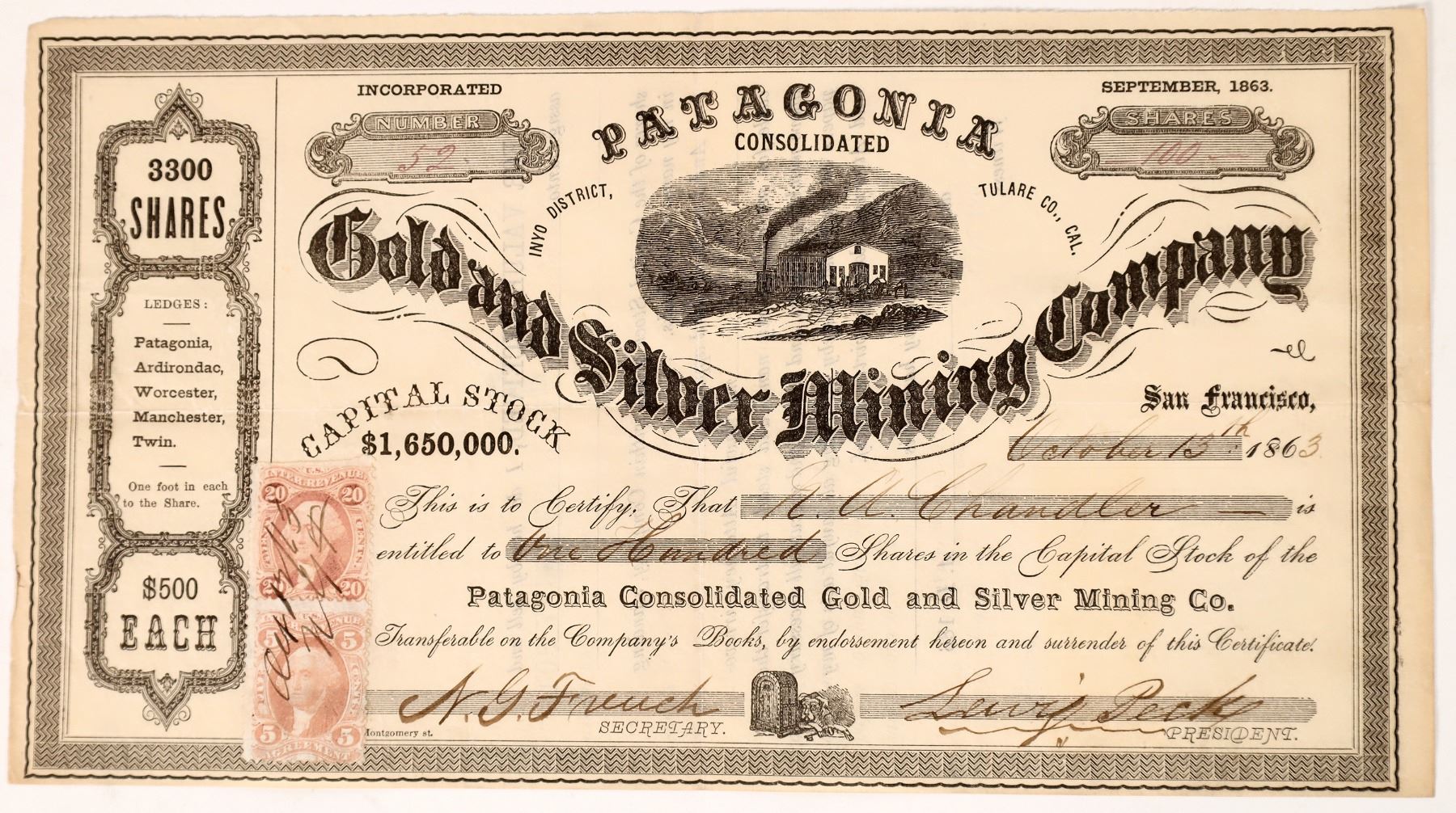 An early mining stock from the early days of the Inyo mining regions. Number 52 for 100 shares to NA Chandler, signed by French as Secretary and Lewis Peck as president. Dated Oct 13, 1863. We don't find many certificates from the early Inyo area of mid-eastern California, with perhaps a total of about ten known from different companies, most of which are unique.