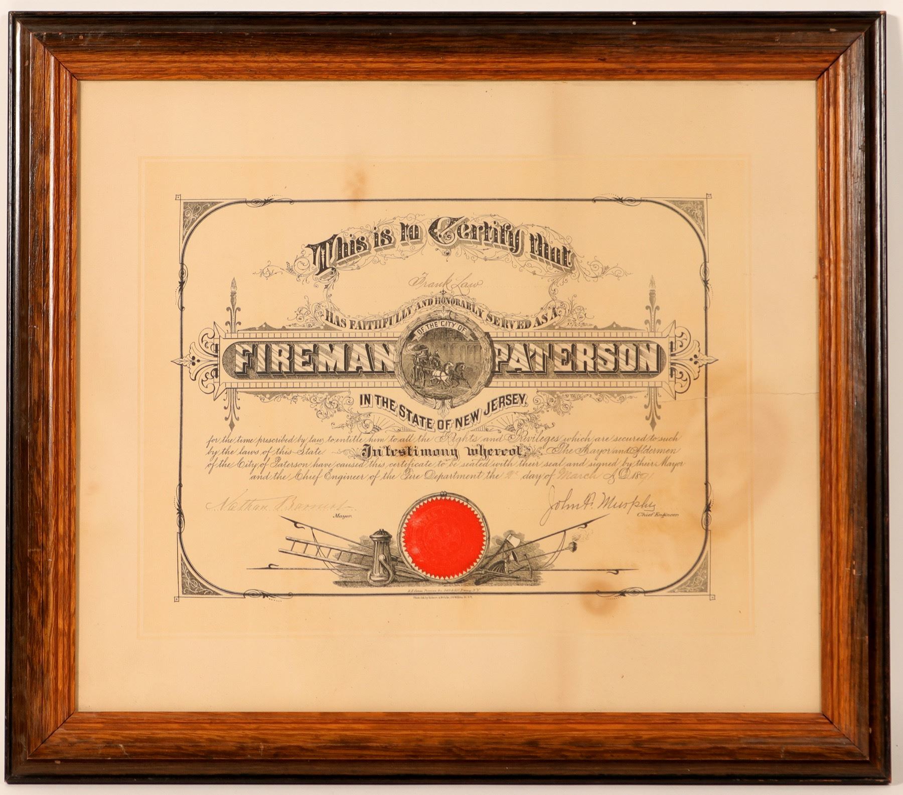 Framed city of Paterson, NJ fireman certificate issued to Frank Law 1891. Fire steamer and apparatus vignettes, red seal. Frame 21x25", 4.5" horizontal tear, toning
