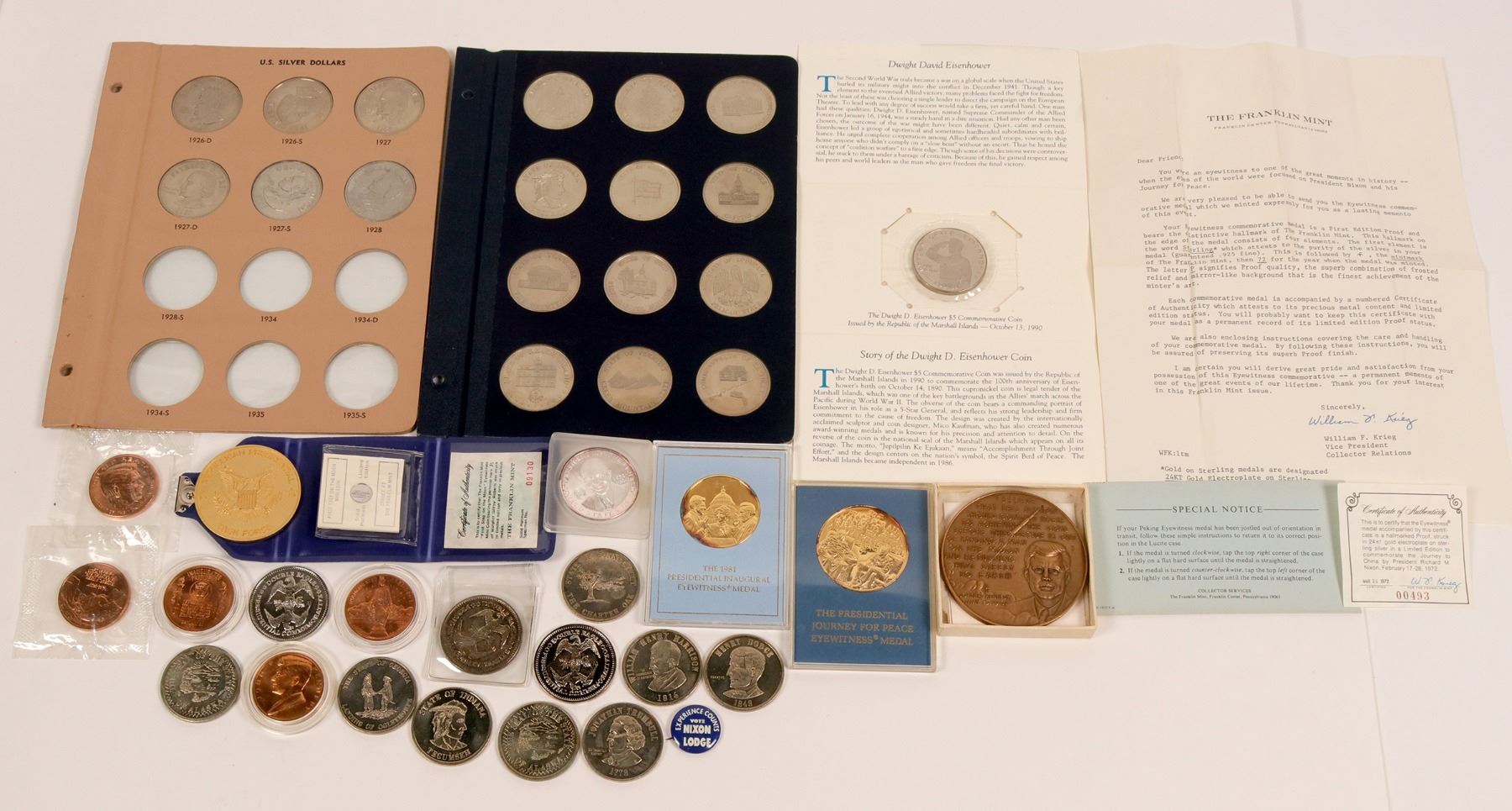 Lot of forty medals celebrating presidents Eisenhower, Kennedy, Reagan, Nixon. Patriotic figures like Roger Williams, Ethan Allen, Henry Clay, Thomas Hart Benton and many others. Also a Franklin Mint issue celebrating the first step on the moon, struck in platinum (it's very small). Also a Nixon/Lodge campaign button.