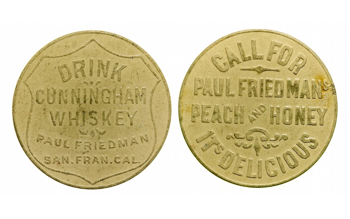 Paul Friedman's Peach and Honey Cunningham Whiskey Celluloid Token
