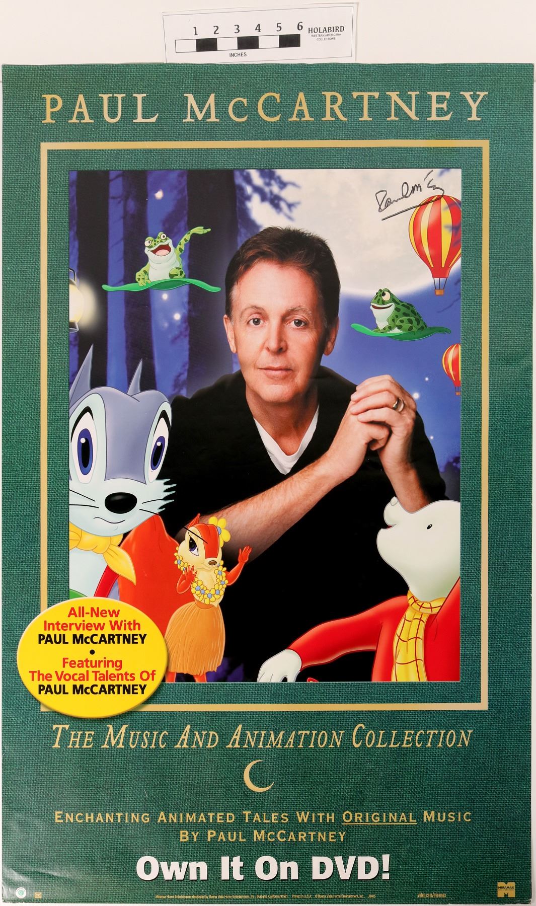 An autographed poster promoting The Music and Animation Collection of Sir Paul McCartney. Paul McCartney's Music & Animation is an animated anthology film compiling three animated short films produced by Paul McCartney. It was released by Miramax Films on DVD in 2004. The film includes Rupert & the Frog Song, Tuesday, and Tropic Island Hum. Paul McCartney wrote or composed music for each short. This poster measures 26 x 40" and the Sharpie autograph is in the upper right-hand corner. I would go into who Sir Paul McCartney is, but, unless you've been in a coma for the past half century... well, you get the point. Poster is in very good condition and the autograph is crisp and clear. Fred Holabird Collection