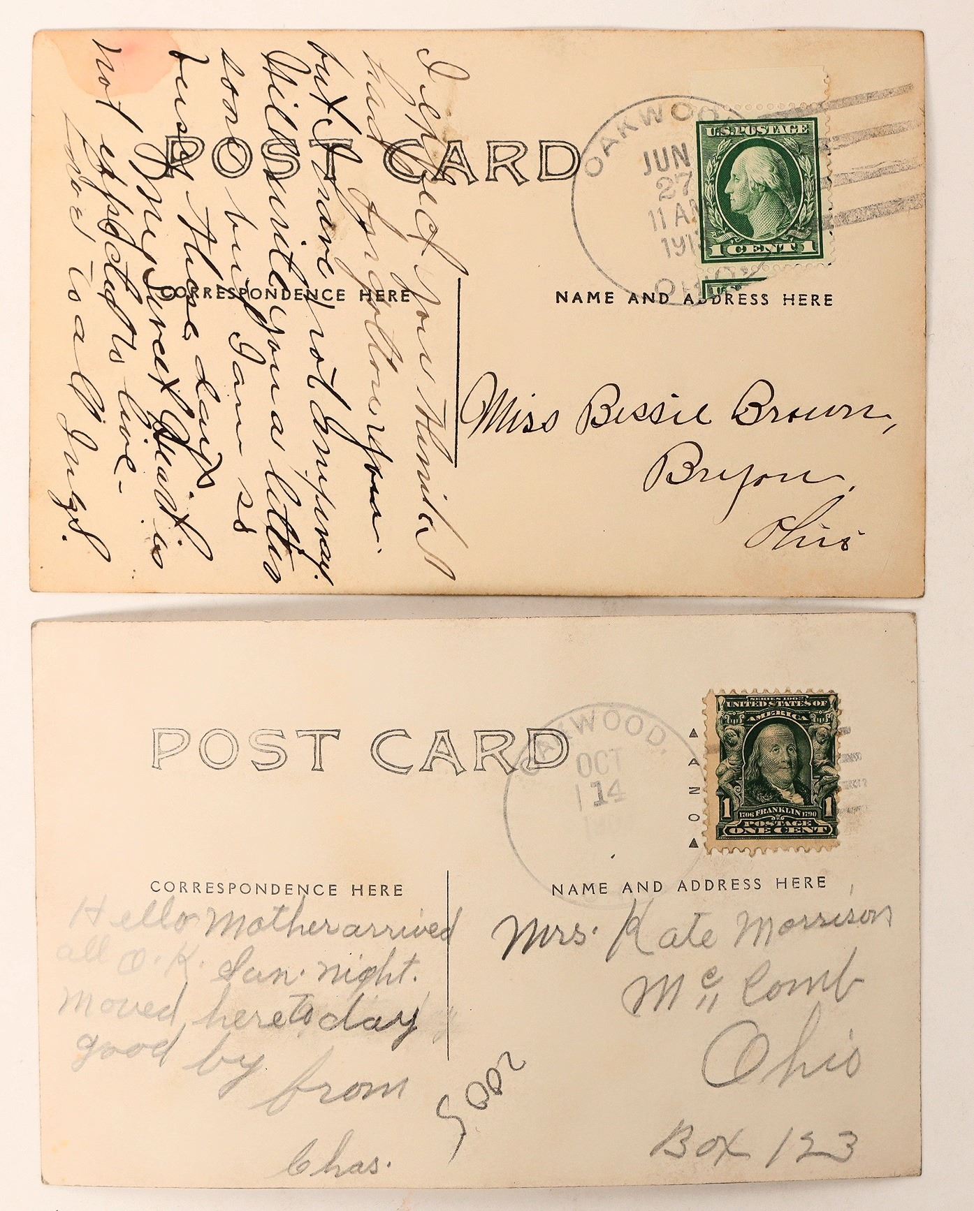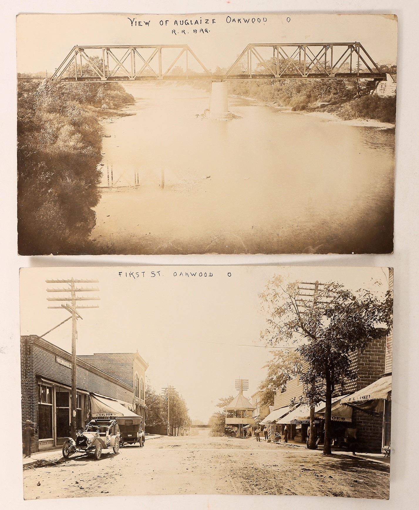 Pair of RPC postcards from Paulding County, Ohio, town of Oakwood, postmarked 1908? and 1913. Includes "View of Auglaize Oakwood O, R.R. BRG.," and. "First St. Oakwood O."[ Ohio