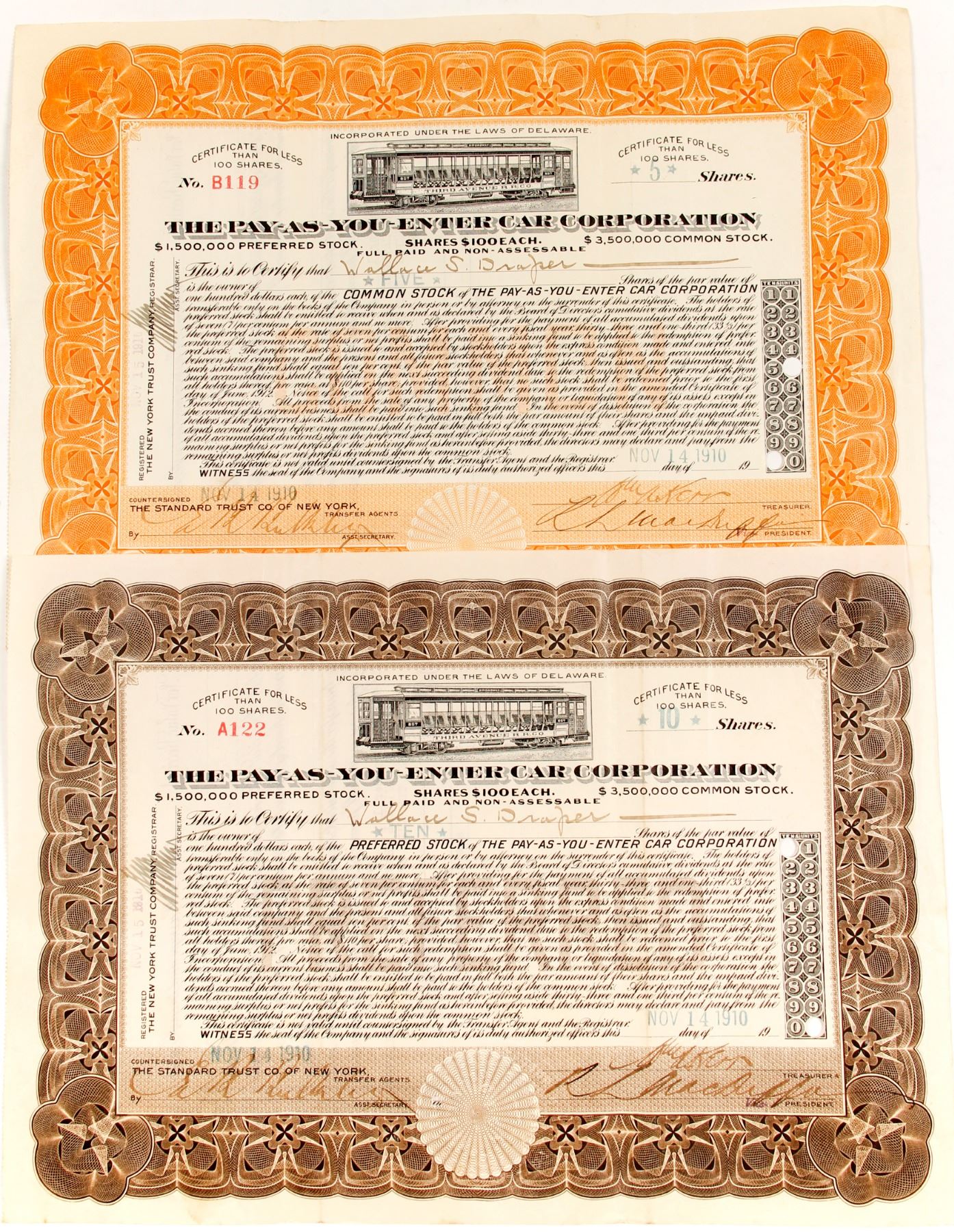 2 I/U. Brown #122 Wallace Draper 10 shares 1910 signed by VP illegible. Orange #119 Wallace Draper 5 shares 1910 signed by VP illegible. What a novel name! Prag Collection State: City: Date: 19101 HWAC# 84233