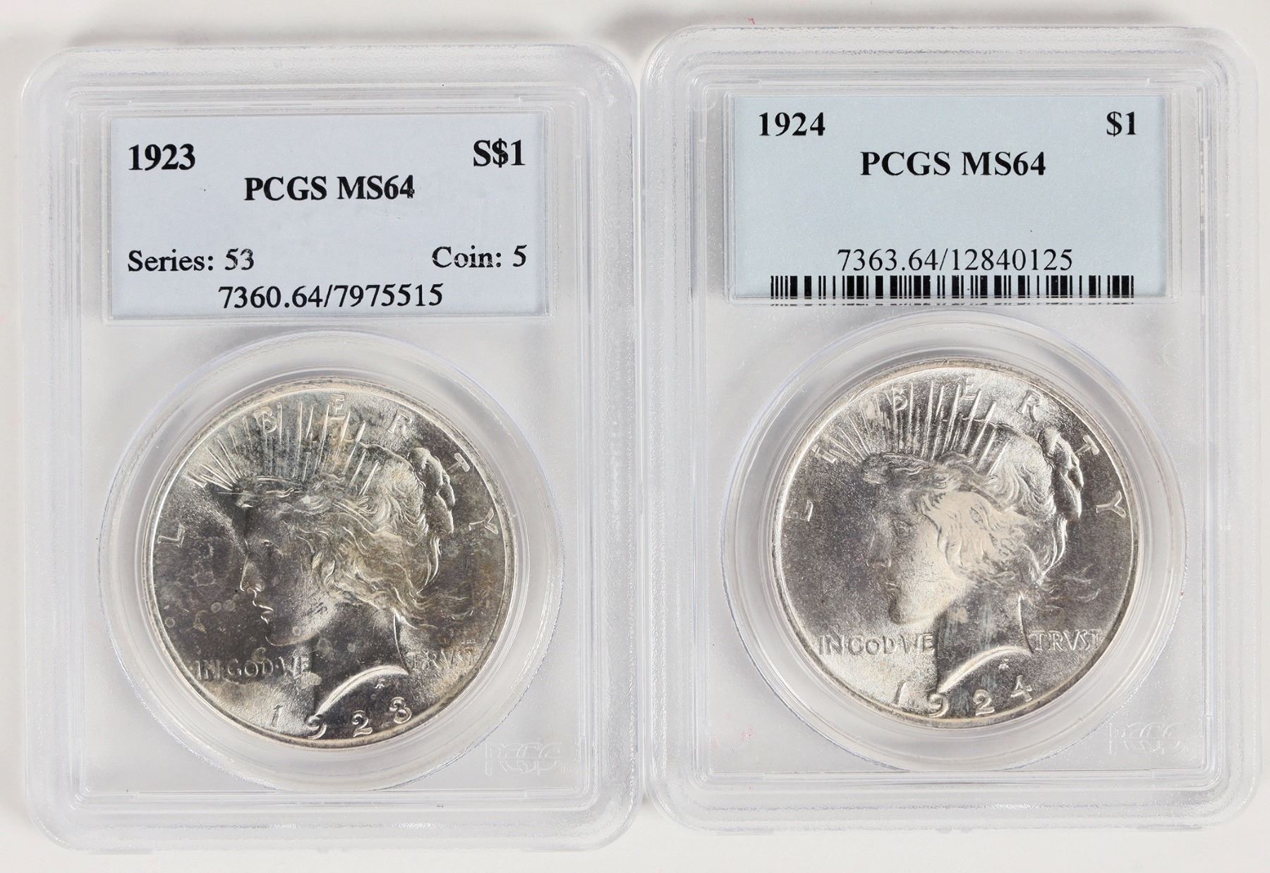Two beautiful PCGS graded MS 64 Peace Dollars: 1923 & 1924.
