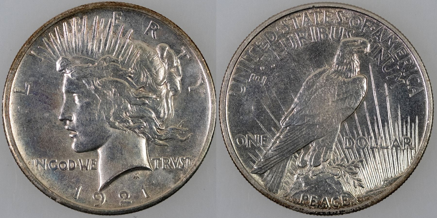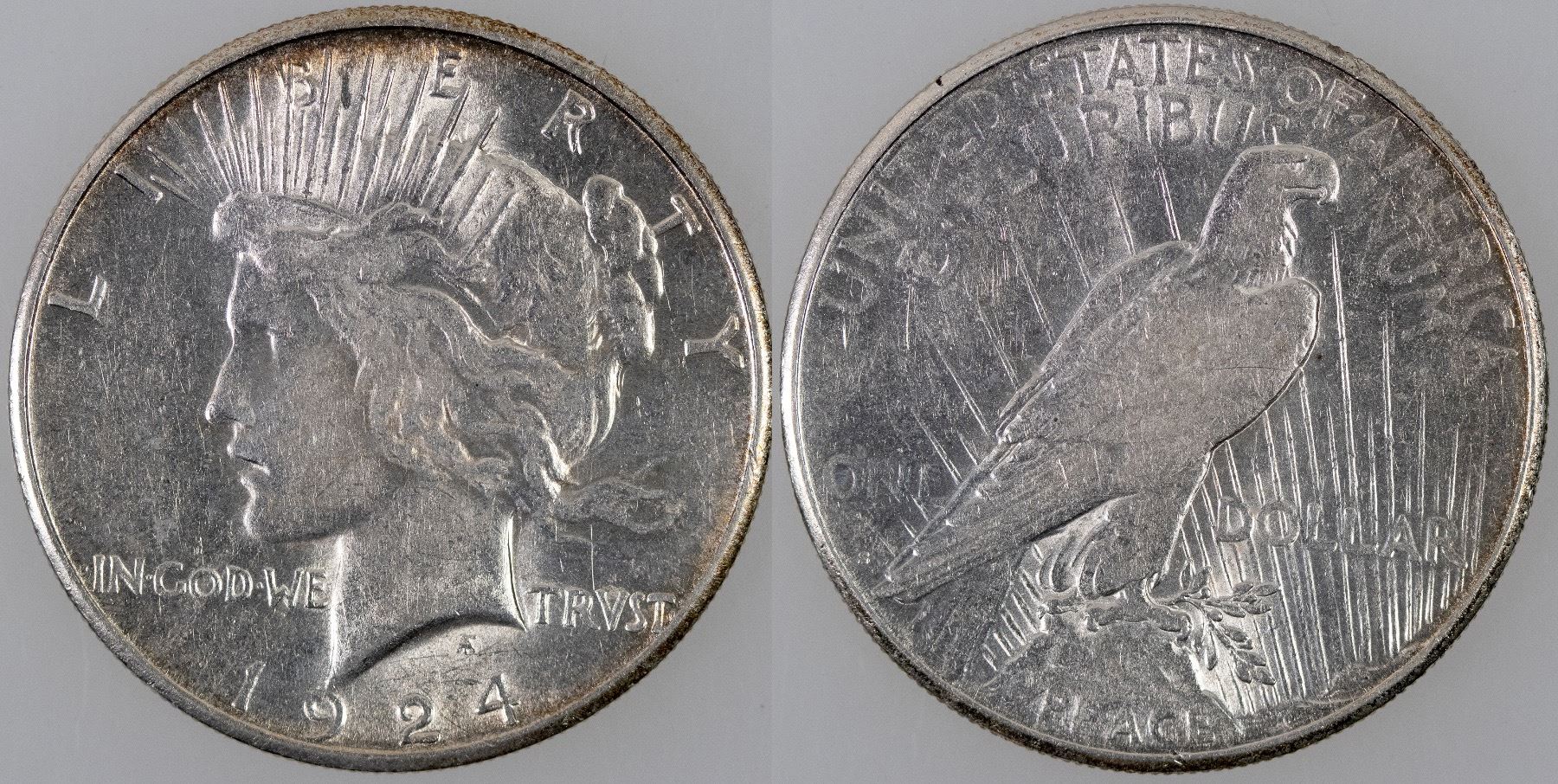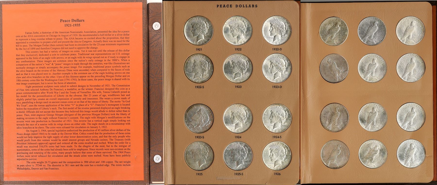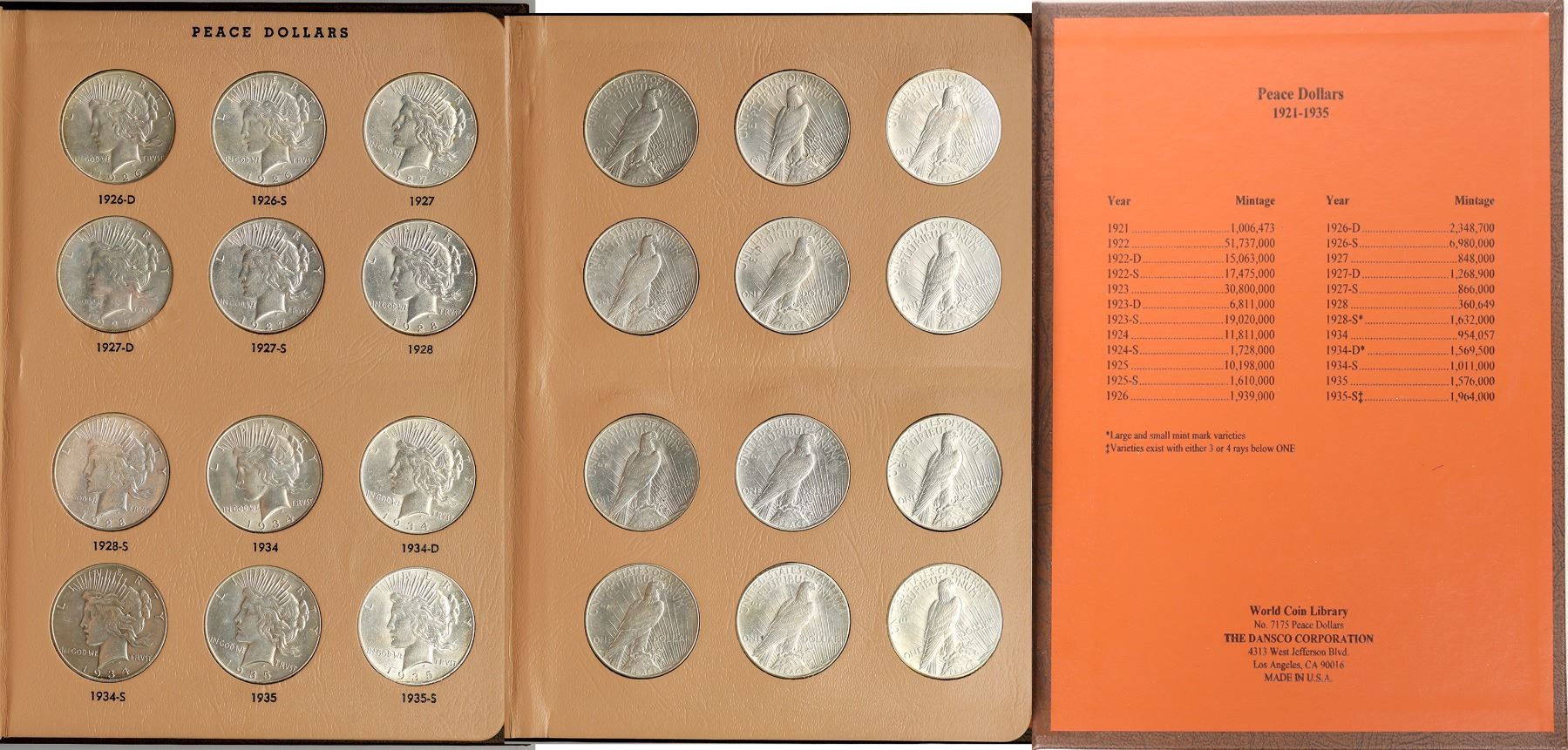 Complete Dansco coin album #7175 Peace Dollars, with 24 uncirculated coins, including 1921, 1924-S and 1934-S. Wow! At first glance, these all looked uncirculated. But they are not. Please inspect. Our opinion is that the 1921, 1927s, 1928s, 1934s are AU. Please inspect!!