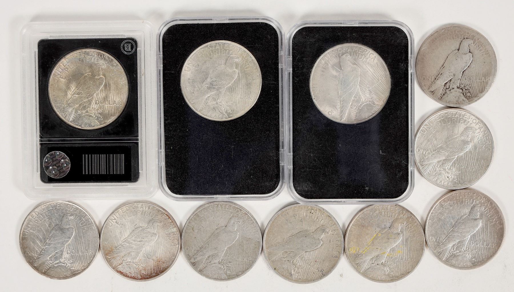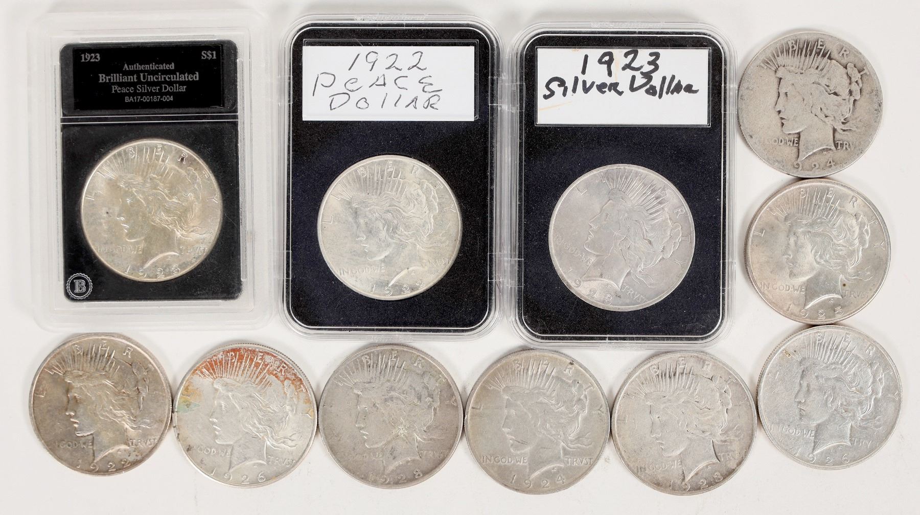 Eleven Peace dollars: 1922; 1922-D; 1923; 1923-D; 1923-S; 1924; 1924-S; 1925; 1926-S; 1926-D; 1928-S. VG-BU condition.