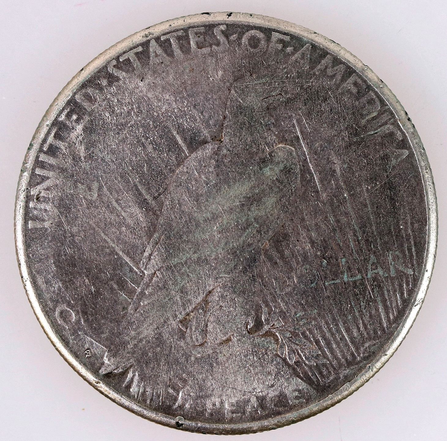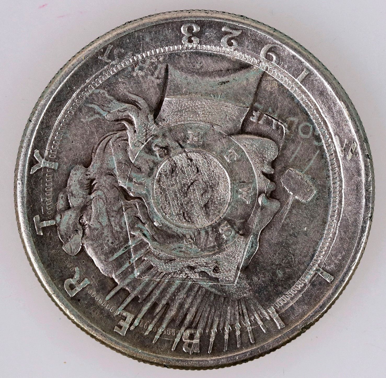 Peace dollar 1923-S counter stamped with Masonic penny on Liberty's face.