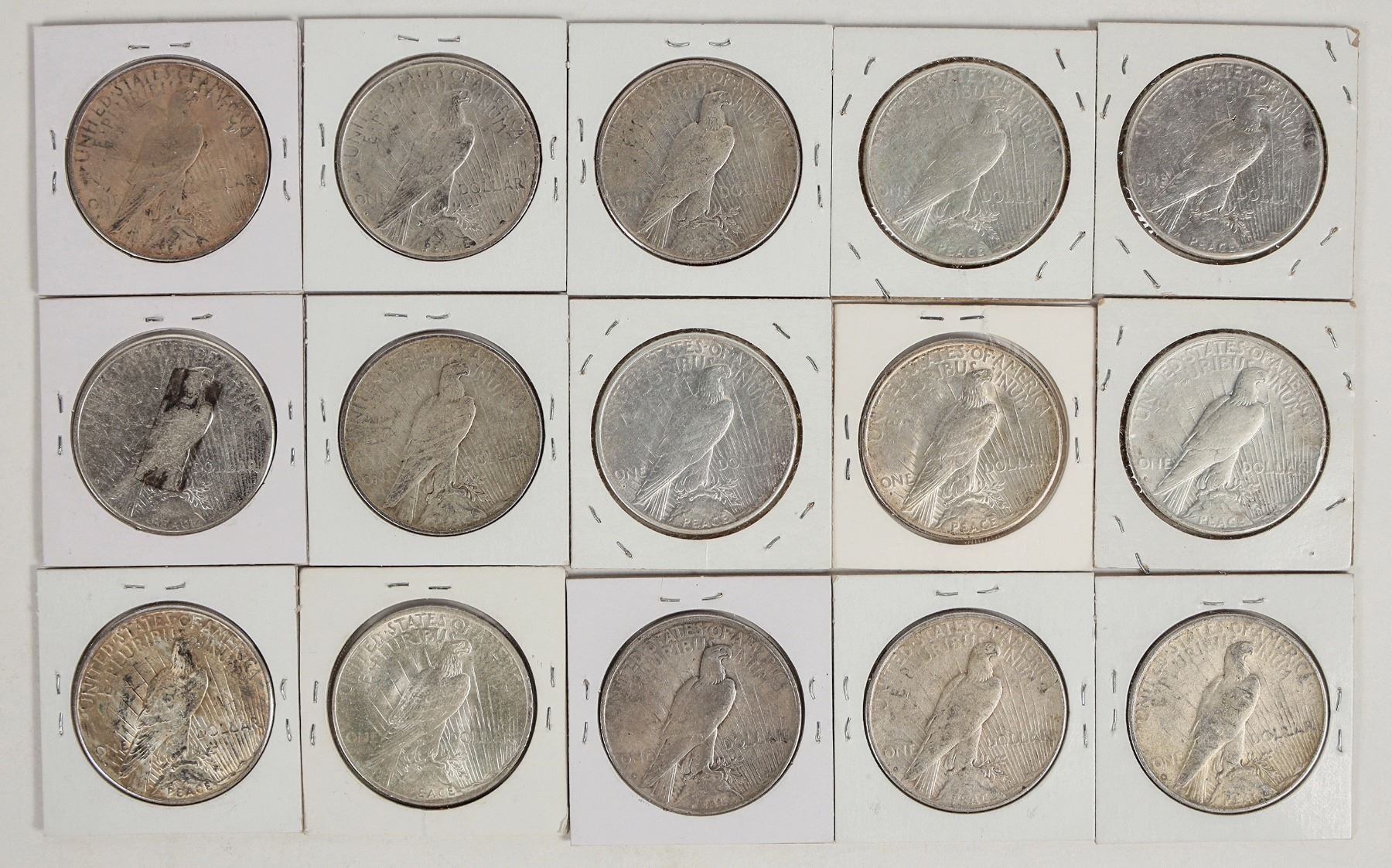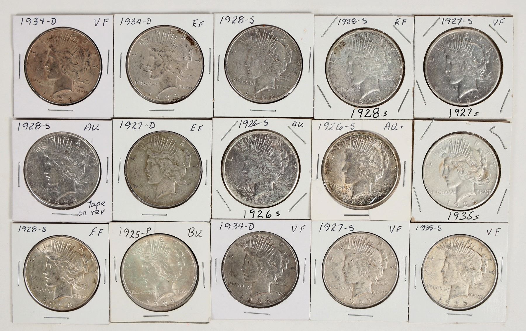 Fifteen Peace dollars: 1925 (BU); 1926-S (2: AU); 1927-D (EF); 1927-S (2: VF); 1928-S (4: EF); 1934-D (3: VF); 1935-S (2:VF).