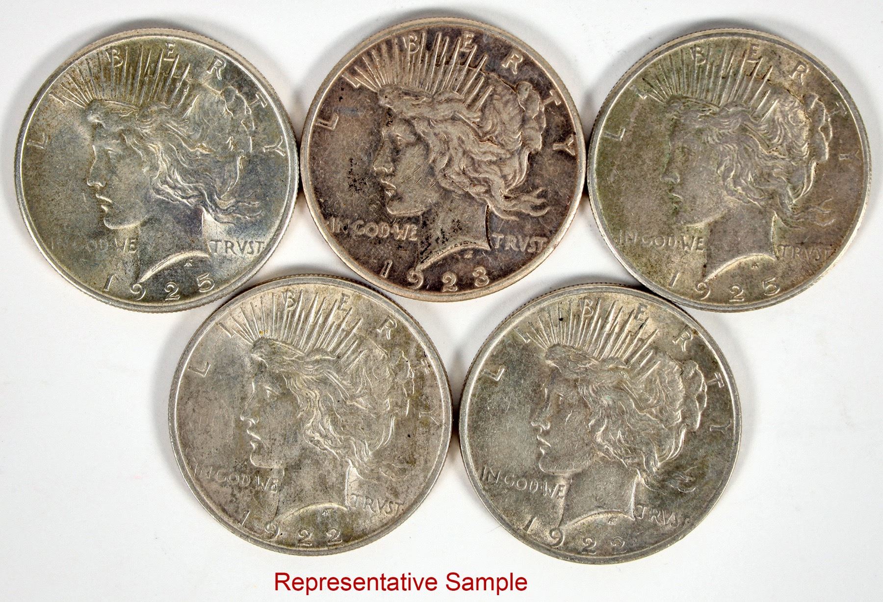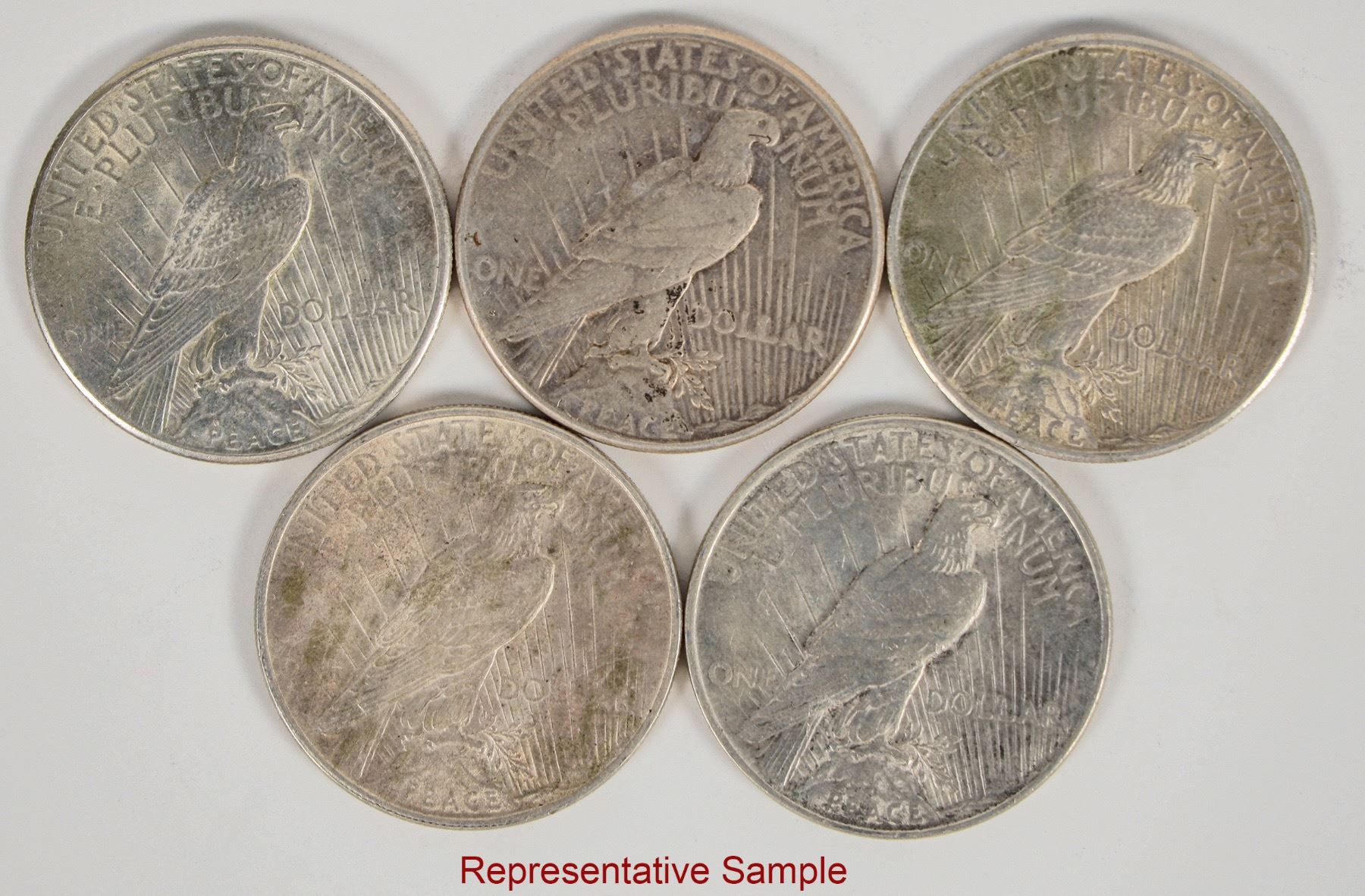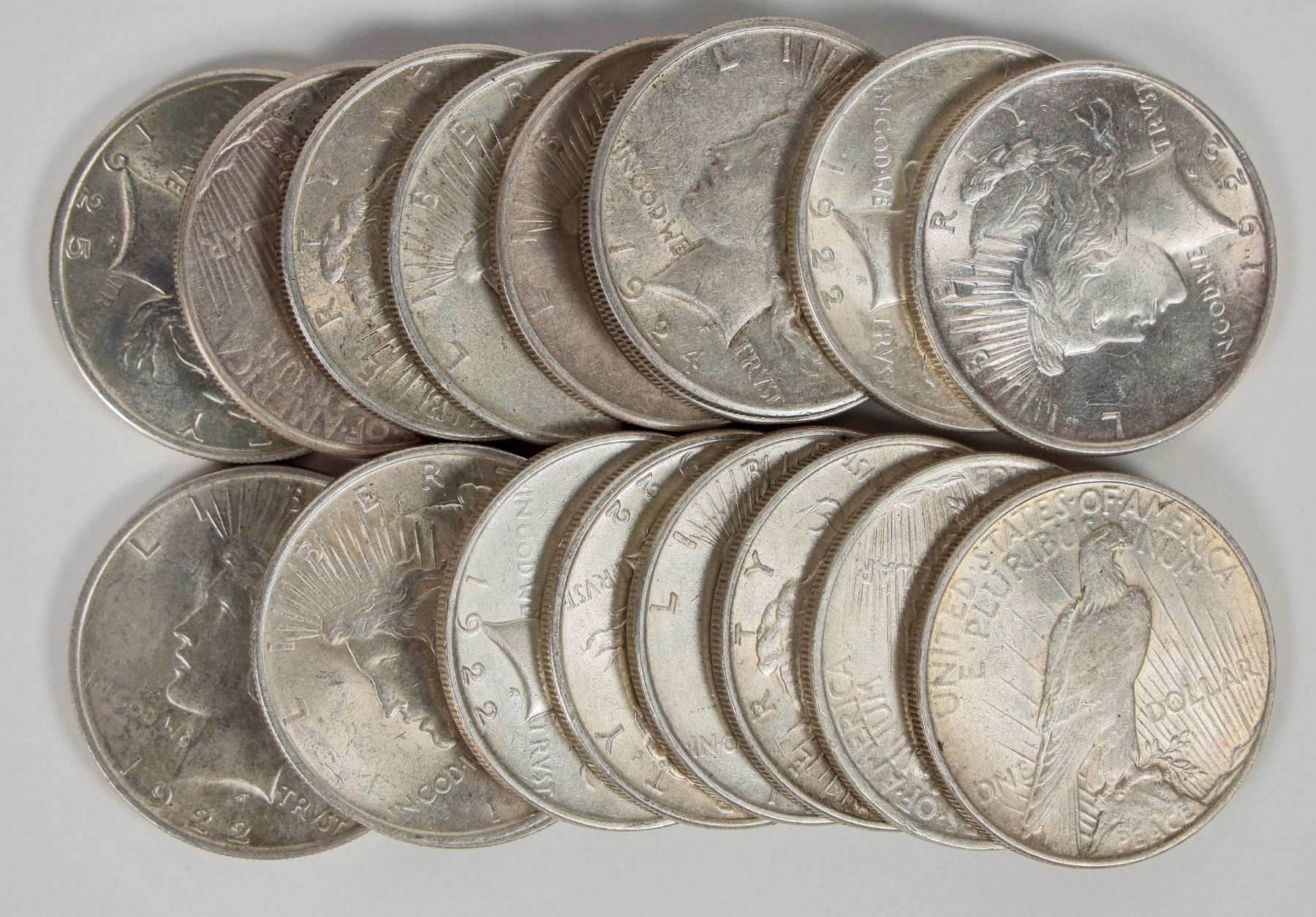 Eighteen Peace dollars, mostly AU. 1922 (11); 1923-S; 1925 (5); 1925-S.