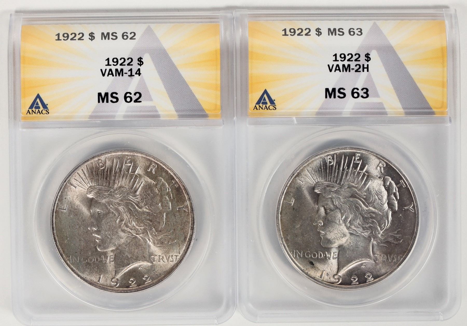 Two ANACS certified Peace dollars: 1) 1922 MS 62; VAM-14; 2) 1922 MS 63; VAM-2H.