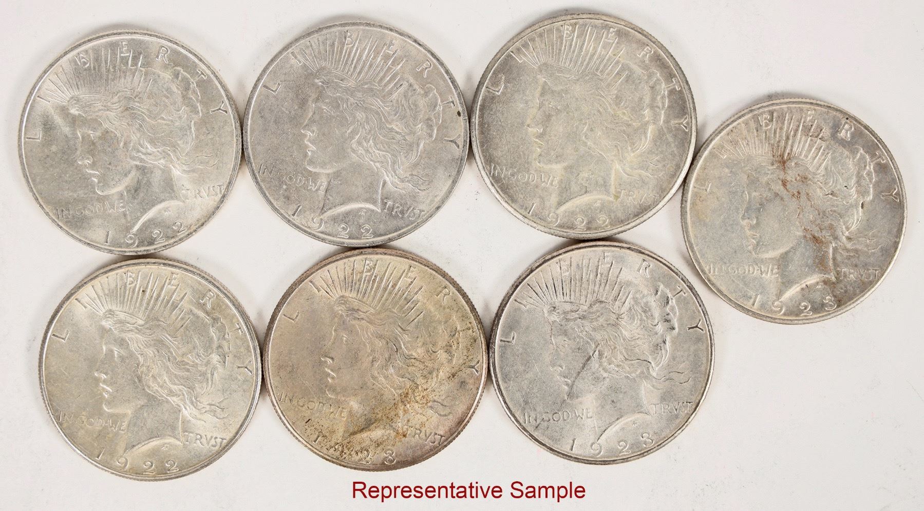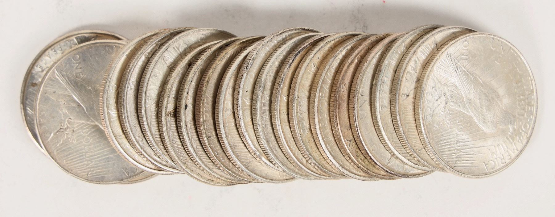 Twenty Peace dollars dated 1922 & 1923, fine to almost uncirculated condition.
