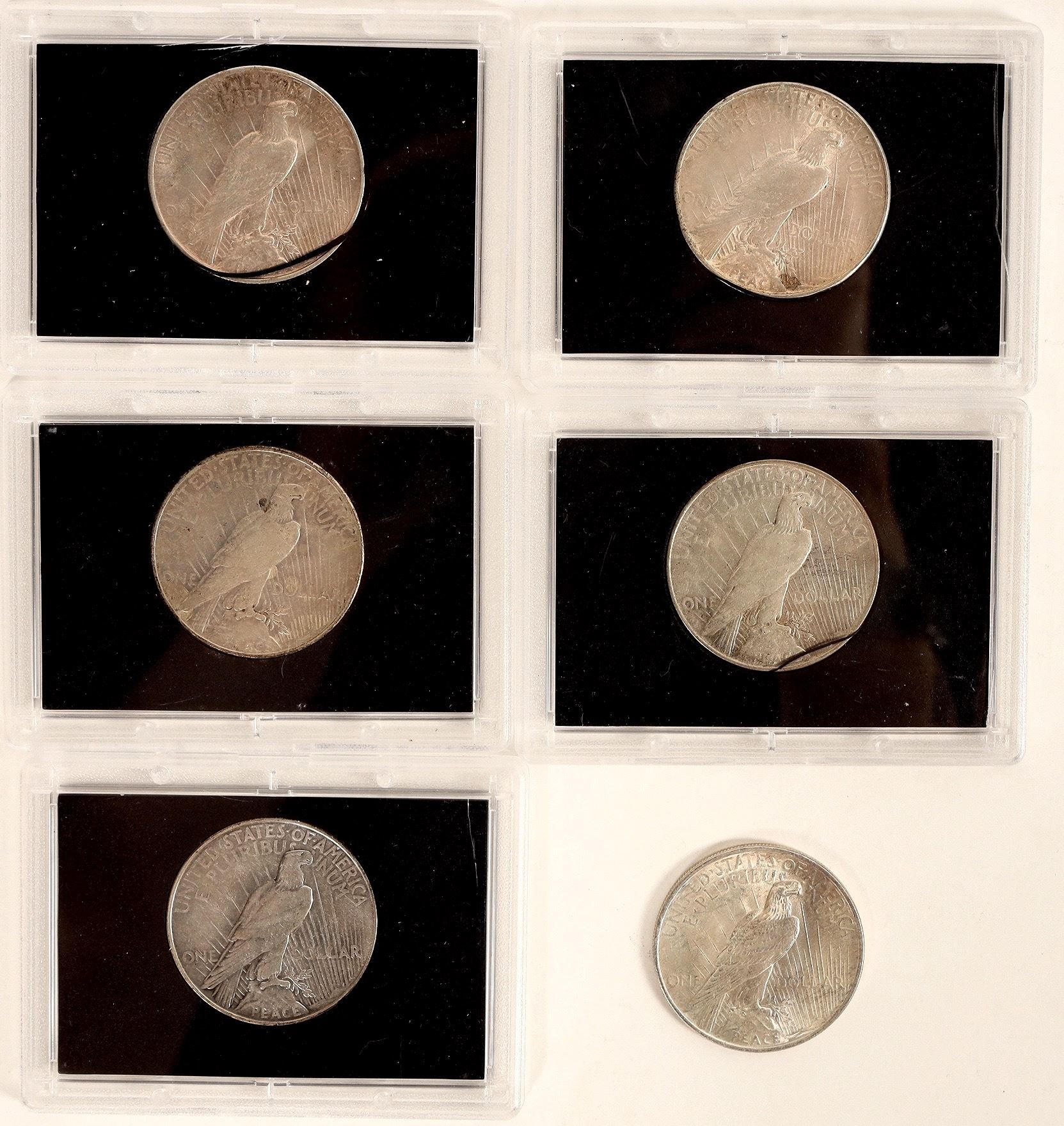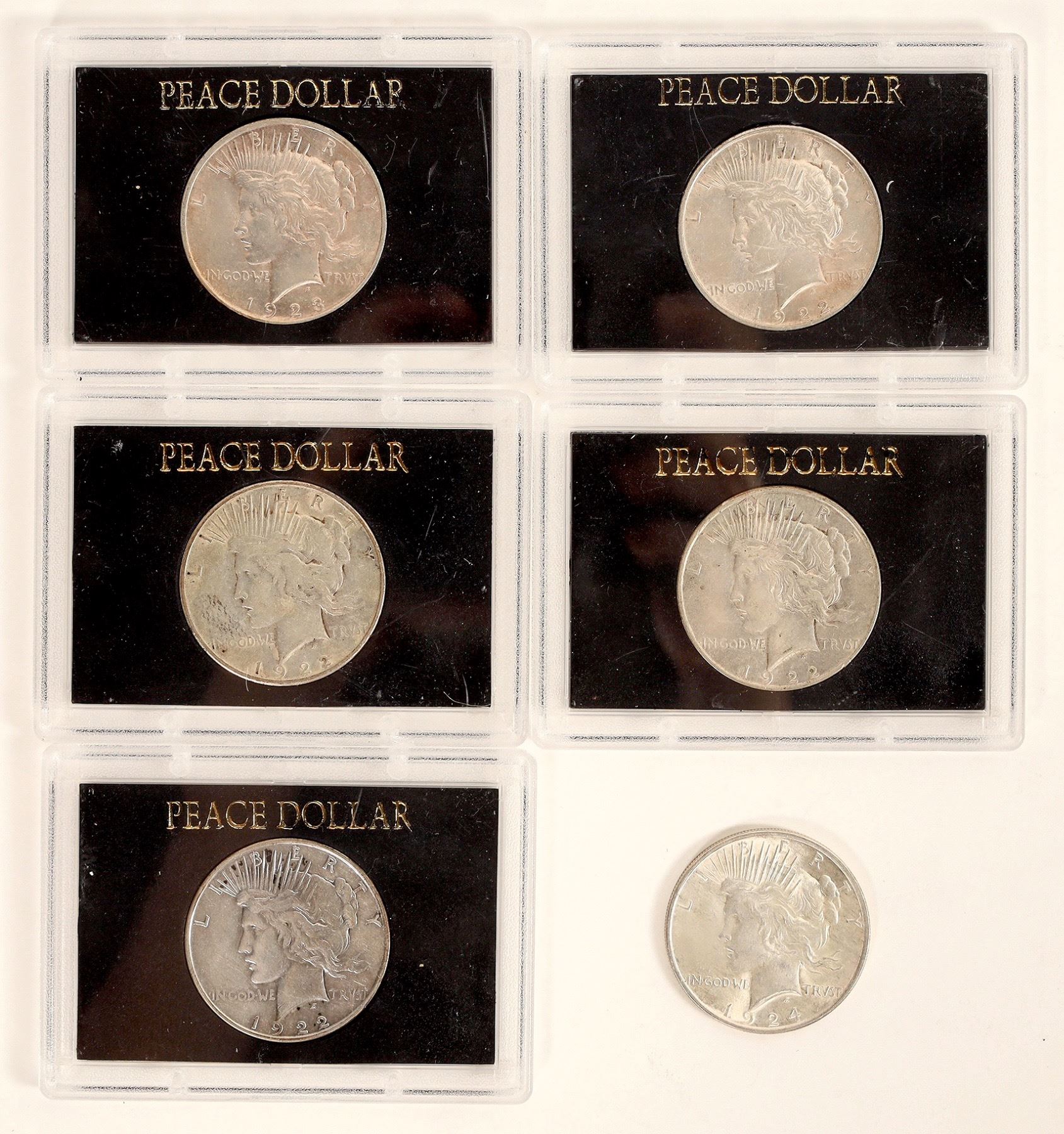 Six circulated Peace dollars, five in hard plastic cases. 1922 (3), 1922-S, 1923, 1924. VG-F condition, the 1924 is EF-AU. [