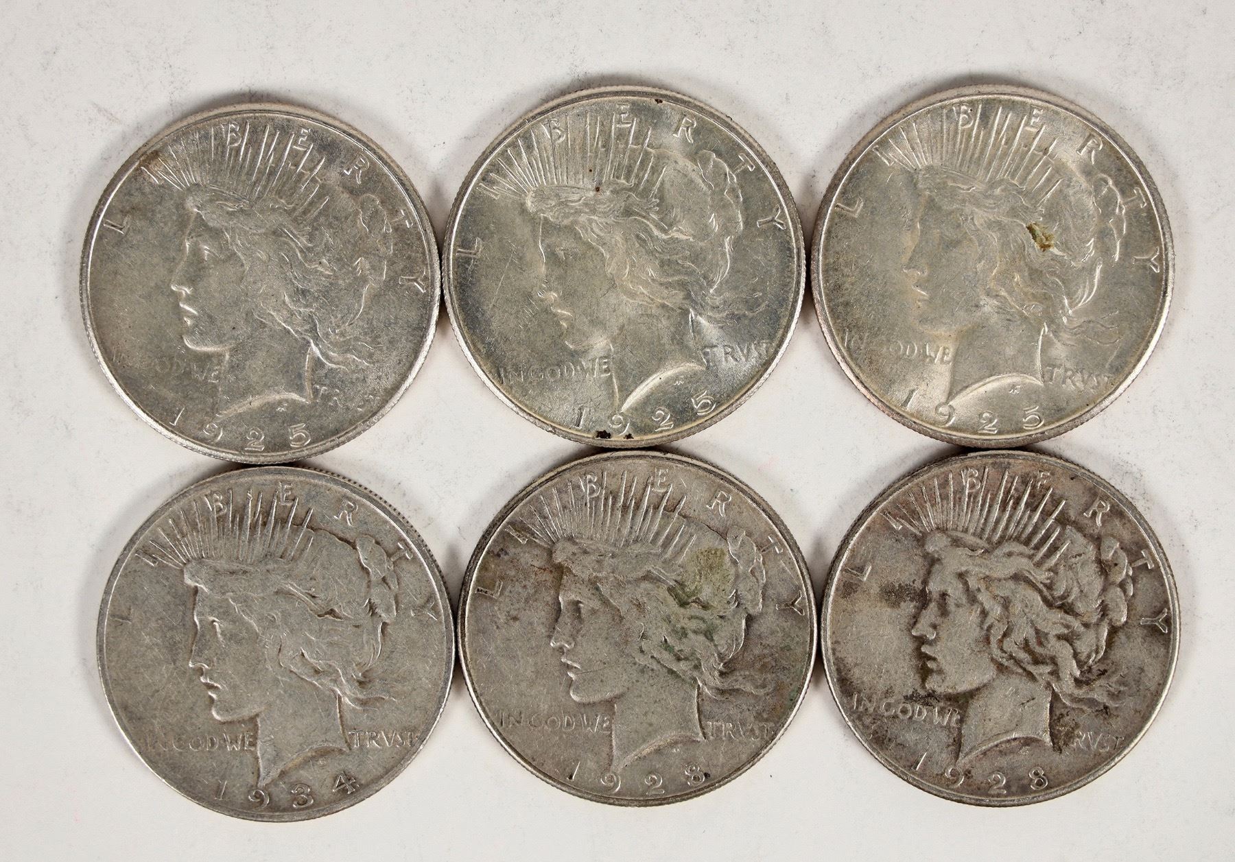 Six better date Peace dollars: 1925-S (3:AU, EF, EF); 1928-S (2: VG-F); 1934-S (VG-F).