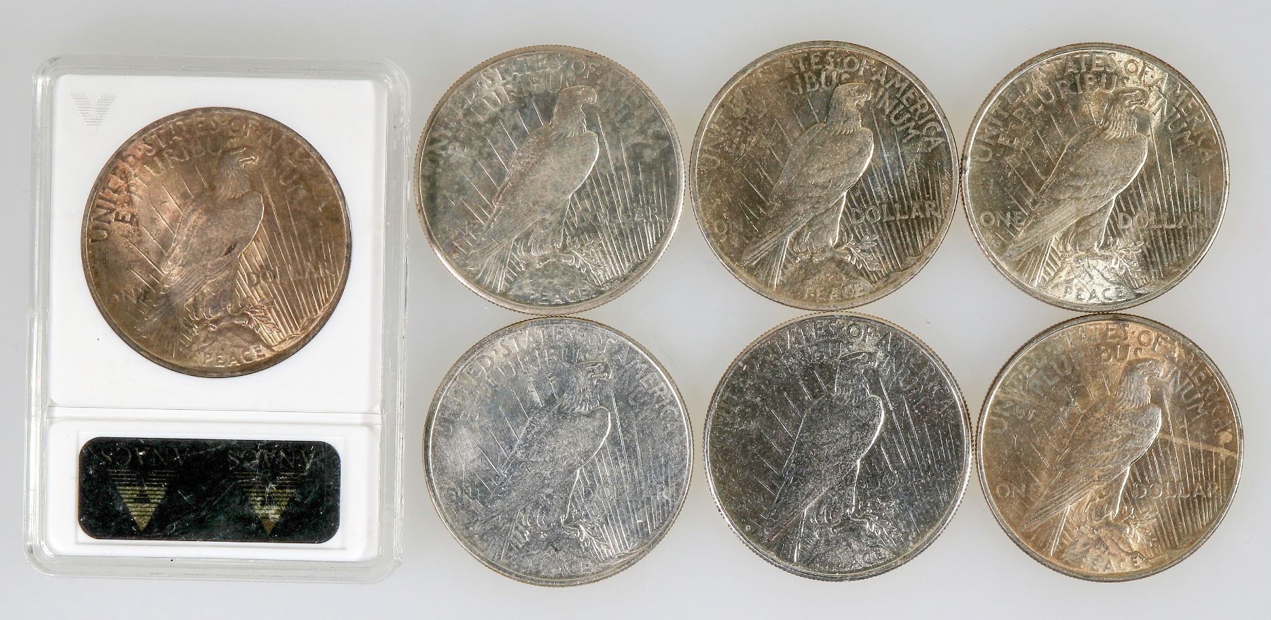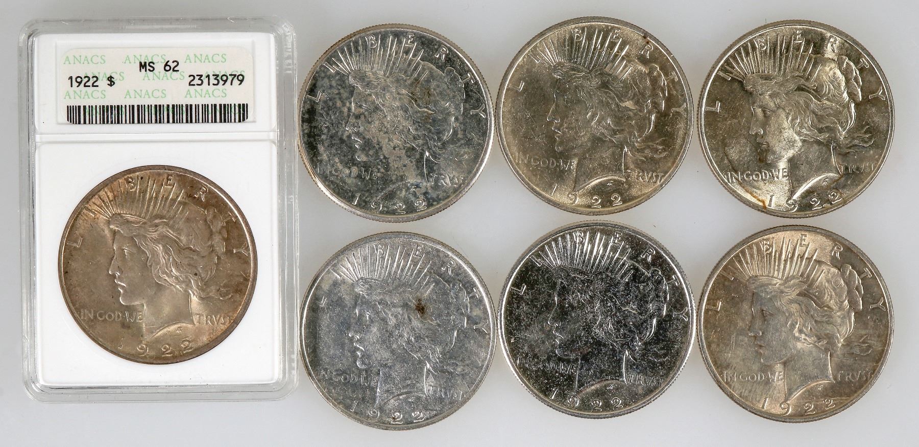Seven very nice Peace dollars: ANACS MS 62 1922; the rest are uncertified, but all AU-BU condition. Two 1922-S, the others 1922 Philadelphia. One light toning spot on one.