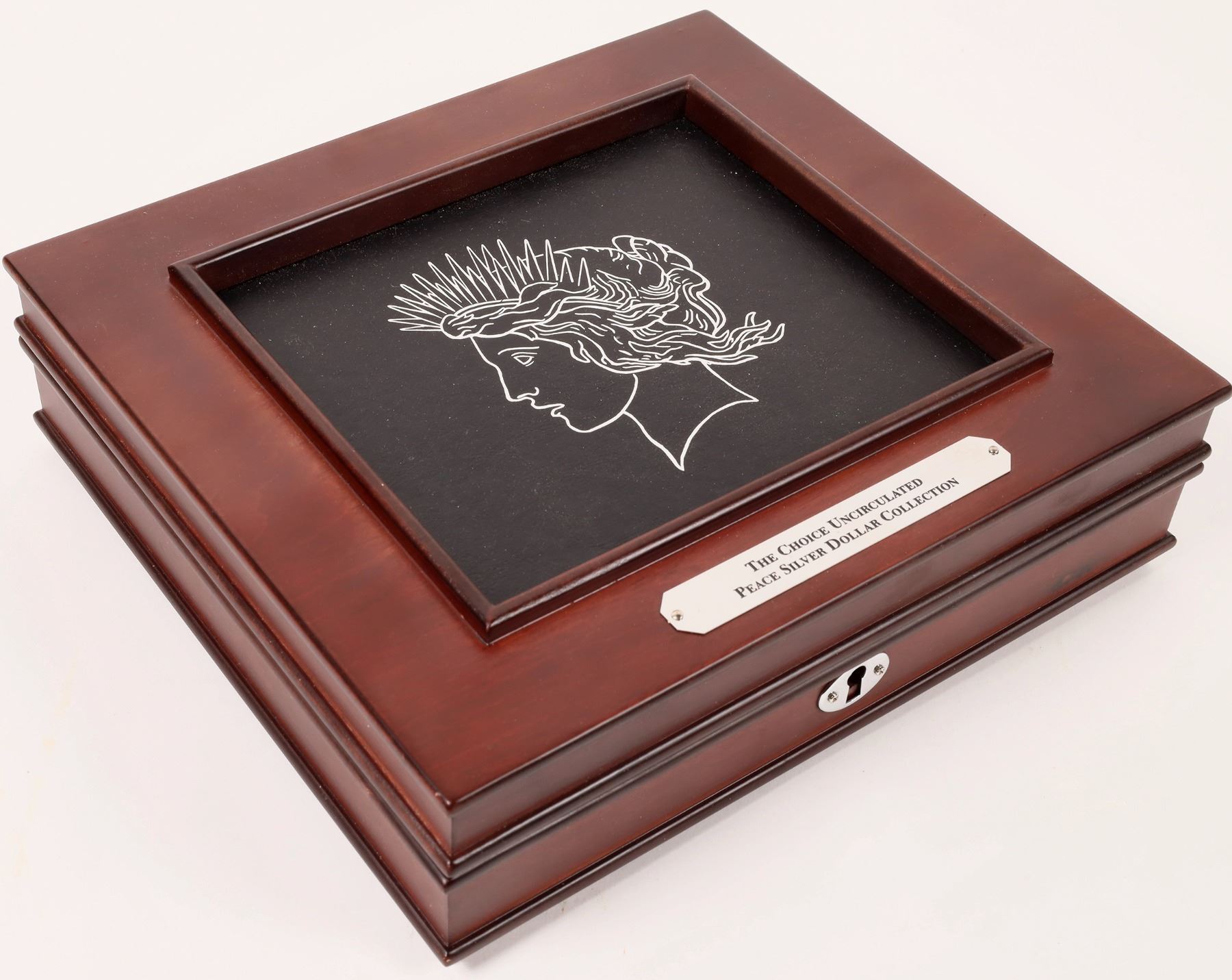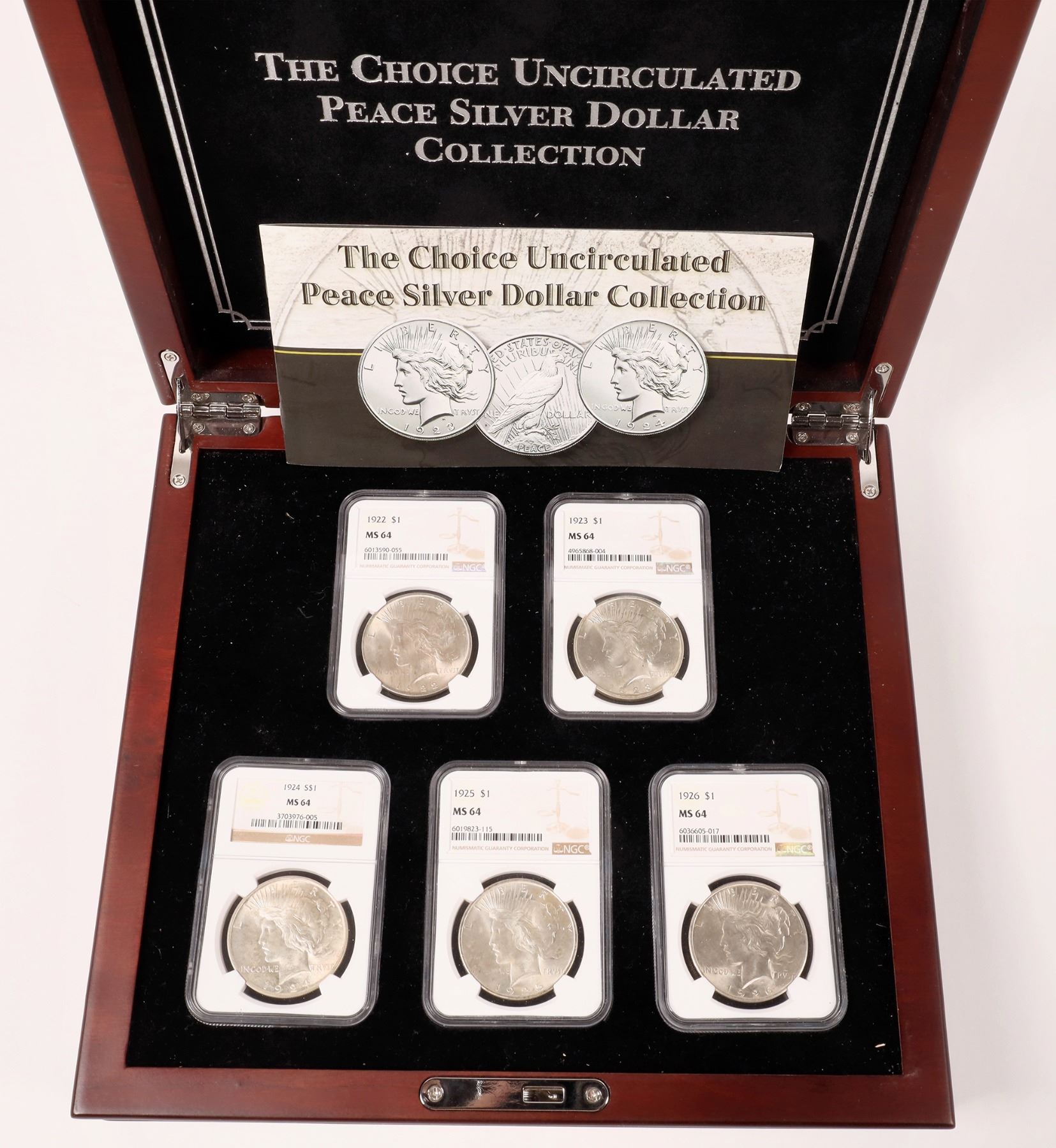Issued by PCS Stamps and Coins: The Choice Uncirculated Peace Silver Dollar Collection. Five NGC certified MS 64 Peace dollars dated 1922, 1923, 1924, 1925 & 1926. The deluxe wooden Display Chest (measuring 10 x 9 x 3") and guide, which includes fascinating details about the history of the Peace Silver Dollar and information about NGC certification and grading, is included.
