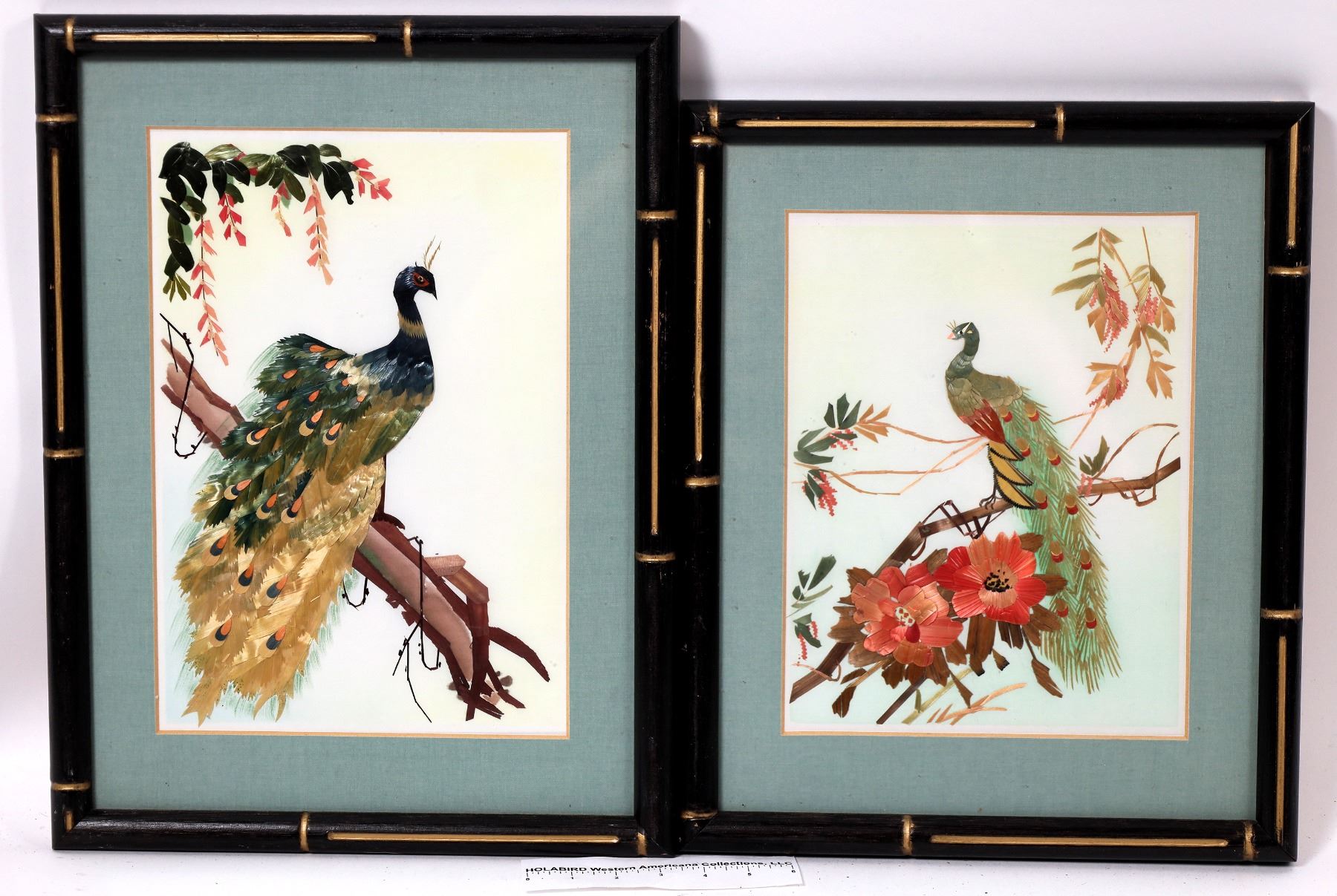 2 framed peacocks made from an unknown thin layered material, perhaps dyed leaf? 10x6.75", frame 14x10.5" and 6.5x8.5, frame 12.5x10.25". Frames have some wear.