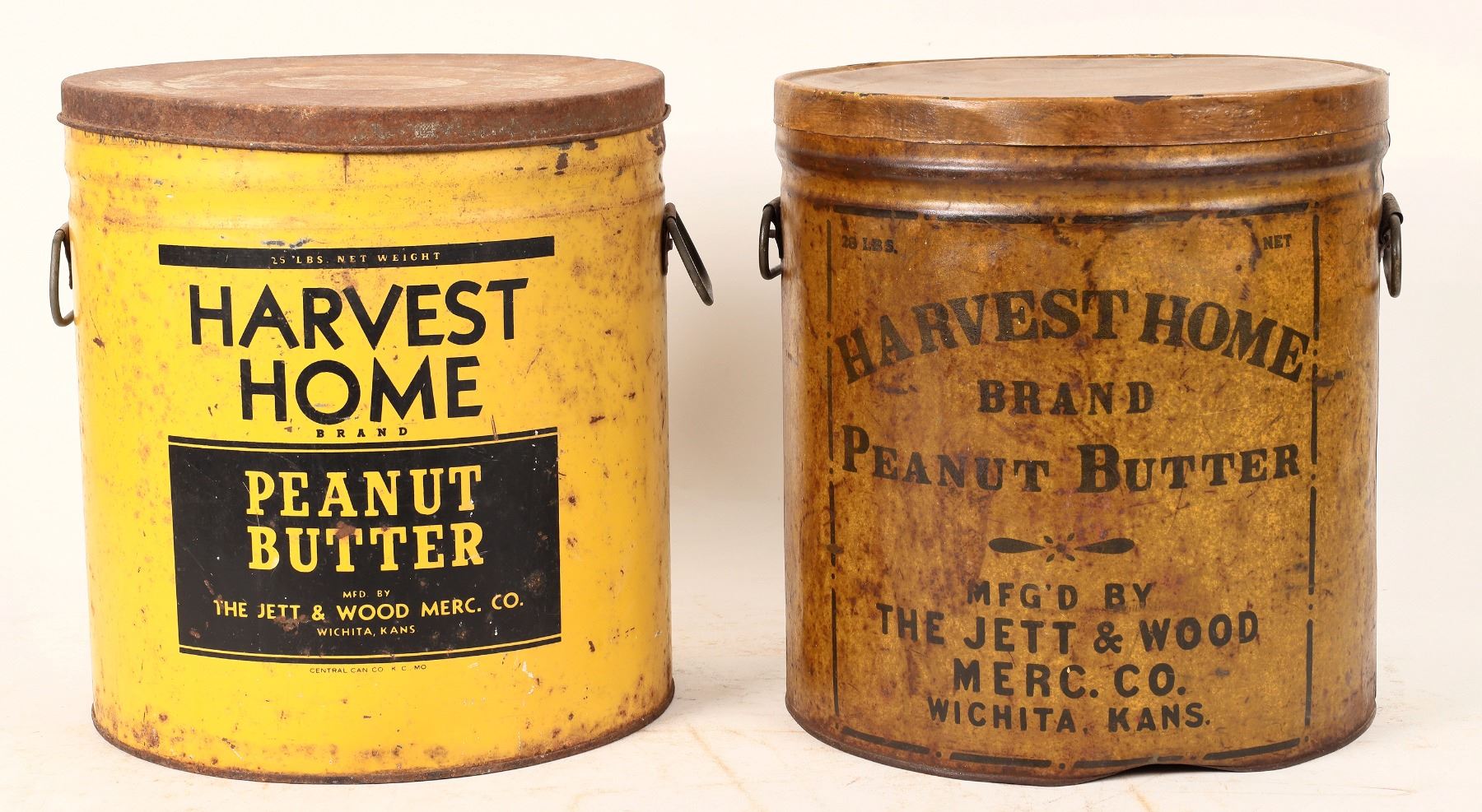 Harvest Home Peanut Butter cannisters (2). This was a product manufactured by The Jett& Wood Mercantile Company of Wichita, Kansas. Each cannister held 28 pounds of product and measure 10"x 11". They do have age rust, but that just adds to the character. Please see photos for more details. Wichita Kansas Gary Bracken Collection