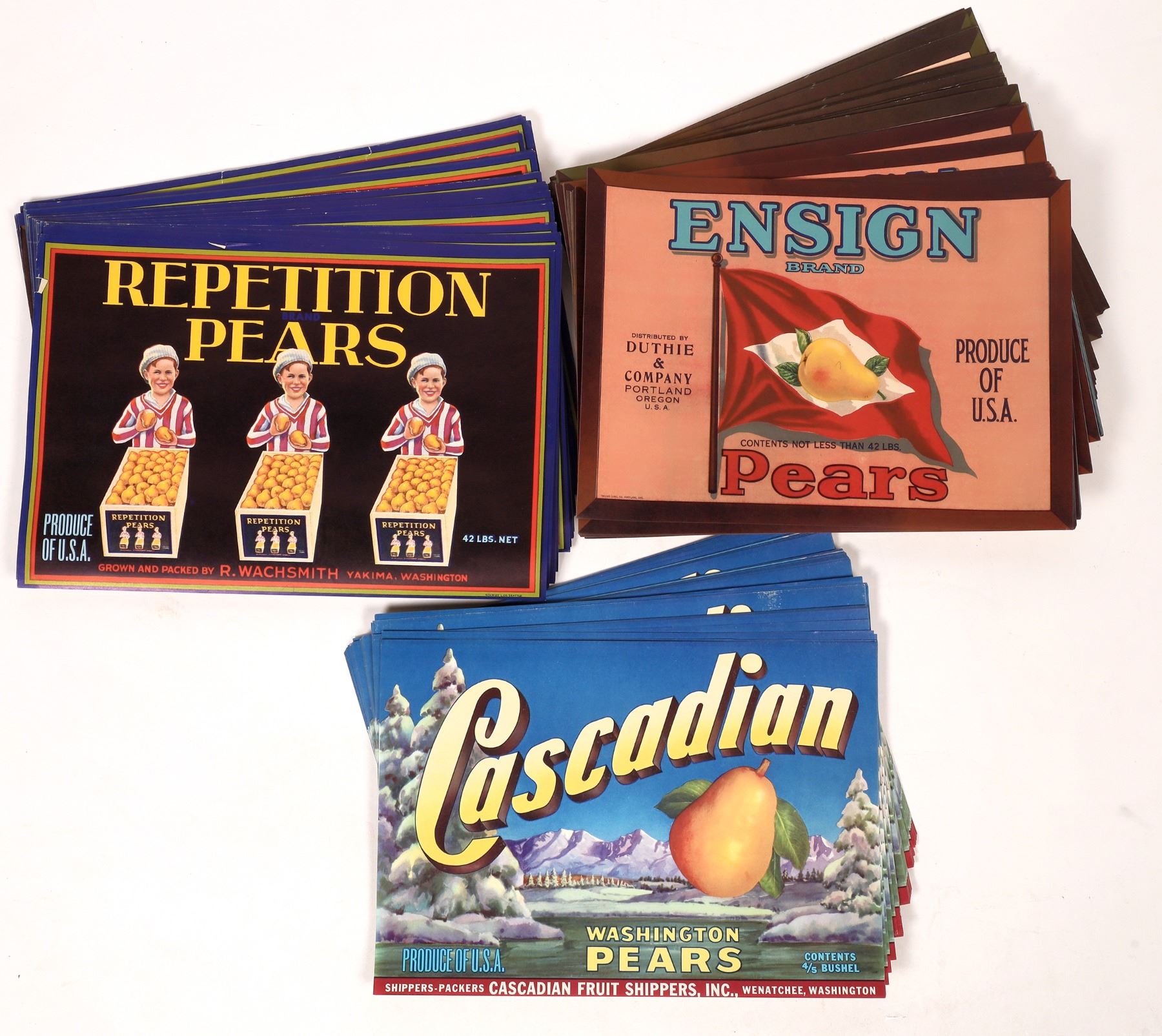 About 400 pear fruit crate labels from Washington and Oregon, 7.75x11". Repetition Pears, Cascadian, Ensign-2 different.