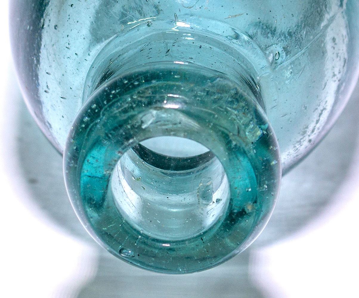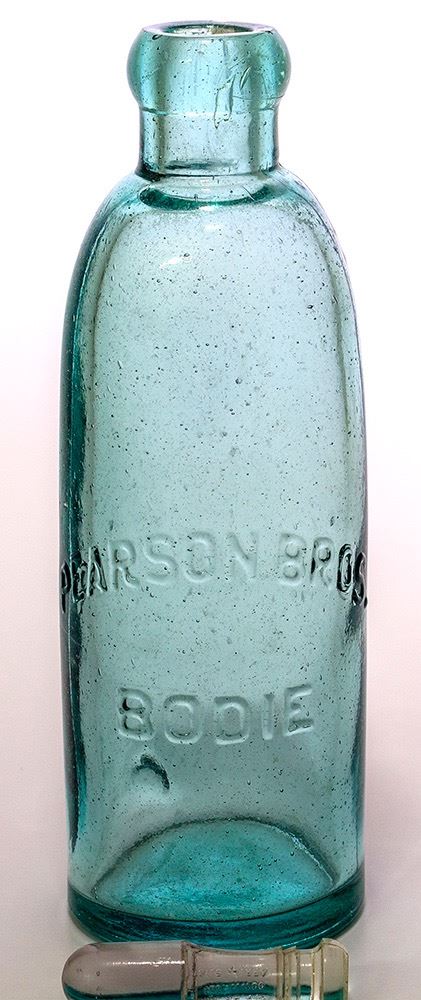 The classic Bodie soda bottle from c1880. Gravitating stopper-style, aqua, full of tiny seed bubbles, very clean. Two tiny imperfections in the lip. Original fold of glass near base in the back, adding to the crudeness and overall aesthetics of the bottle. Includes original Glass Stopper. Pearson is a popular merchant among collectors today. His soda works in Placerville is today a coffee house, erected perhaps in the late 1850's. In that building, Pearson put out at least four different embossed soda bottles from about 1870-1900. He also opened a soda works at Bodie that lasted about three years, and another in Carson City, which has no known embossed bottles. This specimen comes to us from a major eastern collection, known to the collecting community. City: Bodie State: California Date: HWAC# 50869