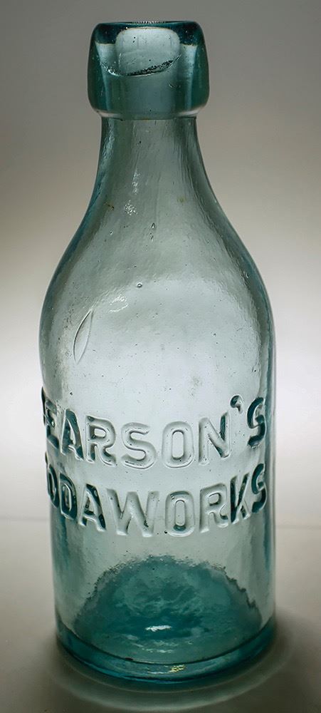Aqua PEARSON'S/ SODAWORKS. Placerville, CA. This business changed hands several times, though the building remained in the Pearson family for some time. The Pearson sons sold the business in 1904 to the Scherrer Bros., who in turn sold it in 1934 to Robert Hook, who turned it into a Coca-Cola Bottling franchise. No visible chips or cracks except as noted. Shamberger collection. City: Placerville State: California Date: HWAC# 50134
