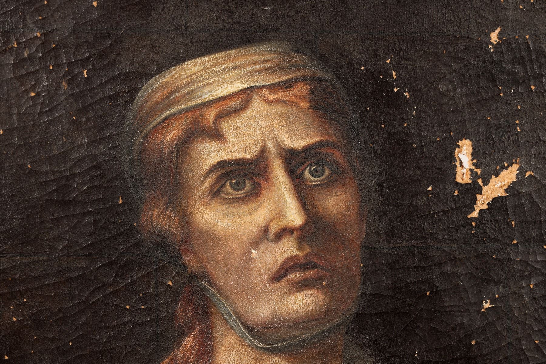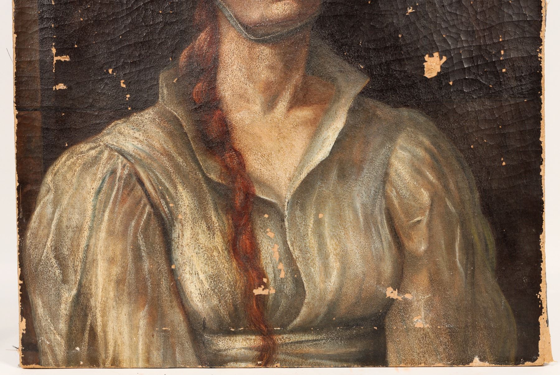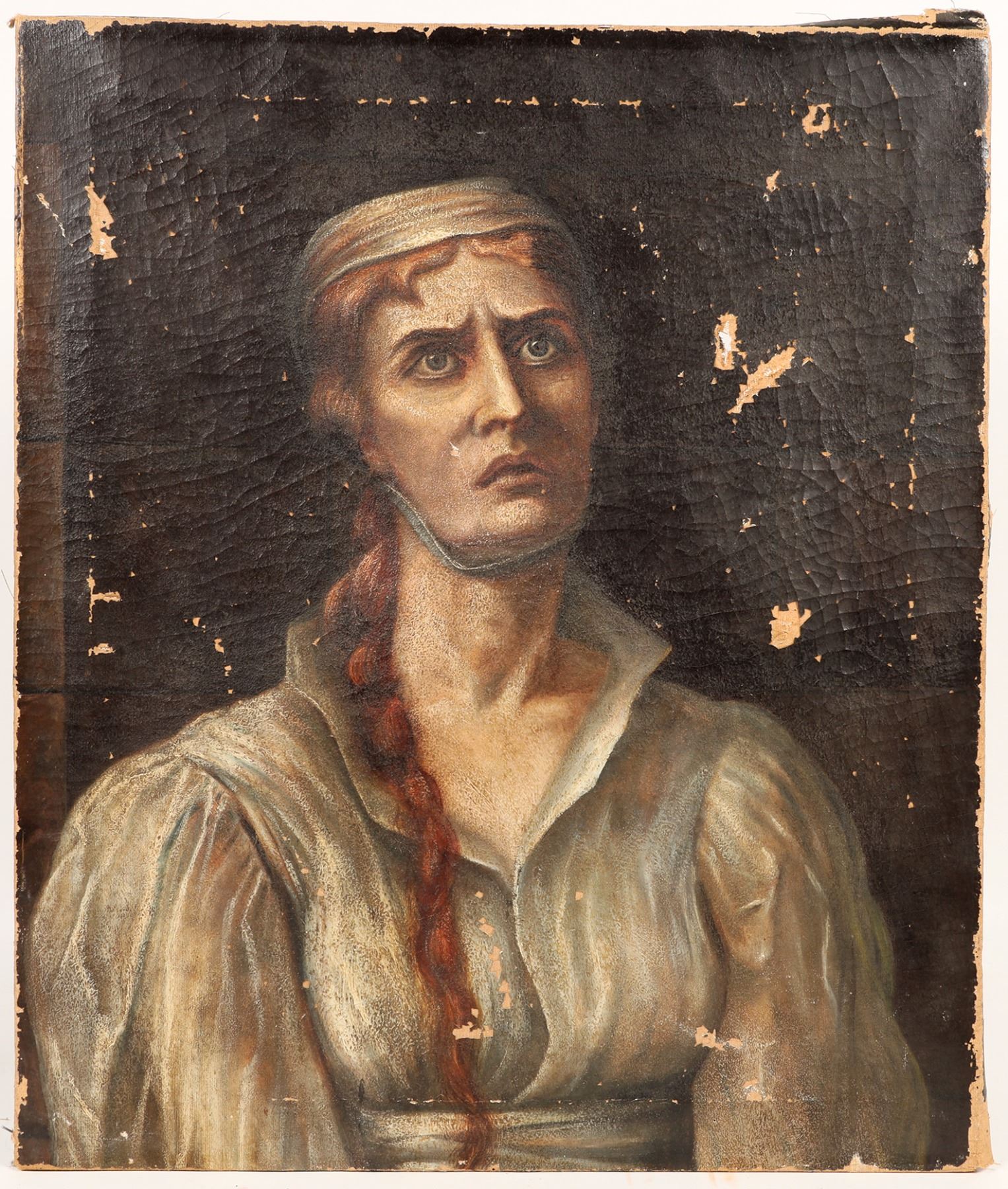 Original, very old, oil on canvas over dark wood stretcher with flat, round nails. Crackle, and moderate damage, but consistent with c1850-1920 work that has not been restored or handled carefully. Examine photos carefully for condition. Dutch/Fleming Realism. This piece is reminiscent of Van Gogh's Neunan period peasant paintings, such as "Head of Peasant Woman" 1884, but lacks the heavy brush strokes and tell-tale painting style of his "Peasant Character Studies". The subject here is wearing a white coif with a chin strap and white collared peasant blouse and, like the peasant women in Van Gogh's pieces, the painting uses a dark backdrop and has a somber color pallet that emphasizes the expression of sturdy strength, hardship and resilience of the work weary subject. Also similar to Jean Baptiste Greuze's peasant subject work, but likely dates later. This original European 19th Century piece definitely deserves additional research....maybe an undiscovered MASTERPIECE! 22"X 26"