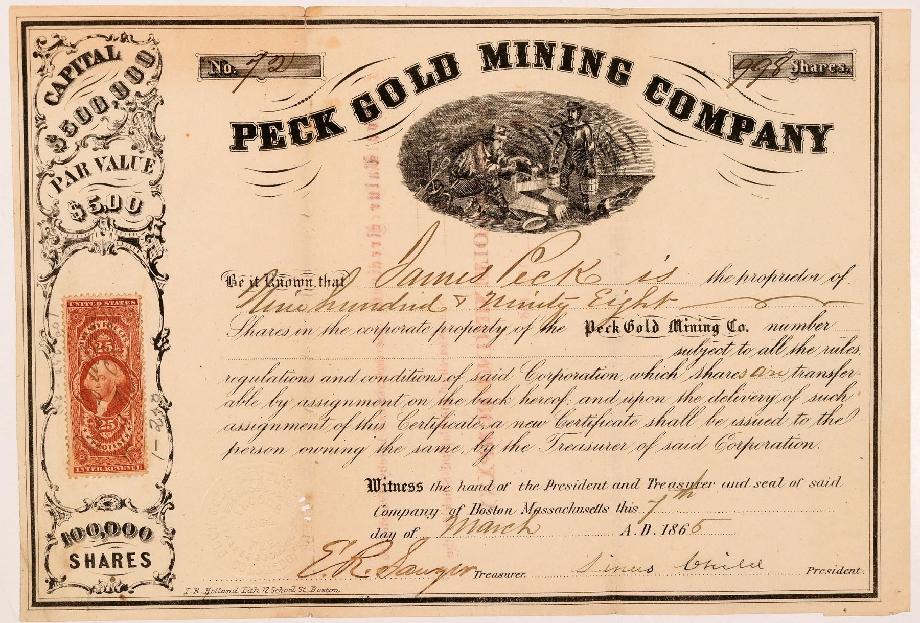 Not offered by us before. No. 72, issued for 998 shares to James Peck (probable namesake of the company) on March 7th, 1865 in Boston. Signed by president Linus Child and treasurer E.R. Sawyer. Not cancelled. Black border and print, rare vignette of miners using a sluice box. Not many of these early 1860s Colorado stocks have vignettes. Printed by TR Holland, Boston. 25 cent US IR stamp attached on the left. 6.5 x 9.75" Heavy folds, holes in seal. According to Hollister (1867), the company had 500ft. on the Atlantic Lode, Union District, high up on Silver Mountain, Empire. Ore is run down 1500 ft. on a wooden rail to a 12-stamp steam-mill at North Empire. Shaft is 225 ft. deep. 1,000 tons of ore have been taken out, $15 per ton. James Peck of Empire is their agent (who this stock is issued to). [Hollister, pg. 247-248]  City: Clear Creek County, Empire  State: Colorado  Date: 1865