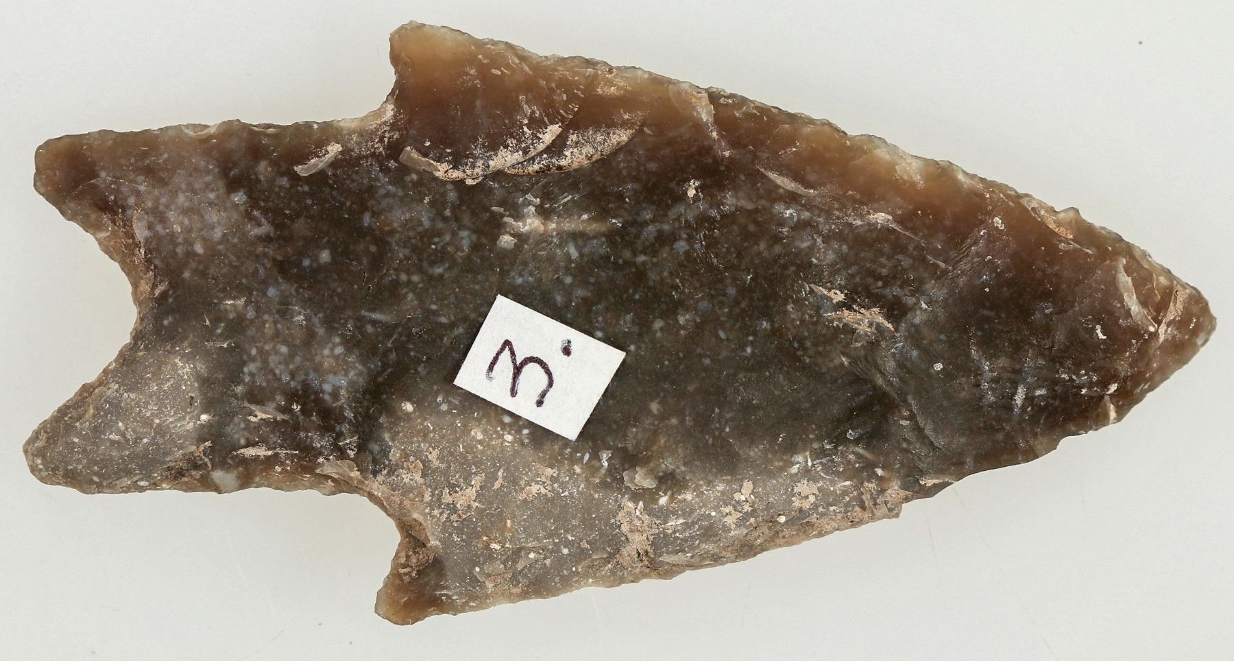 This Pedernales Point was found in Kimble County, Texas in a translucent bi-colored flint at 2.75 n./ 64mm. The stem is straight with a bifurcated base. In perfect condition. #3. Please see photo for details.