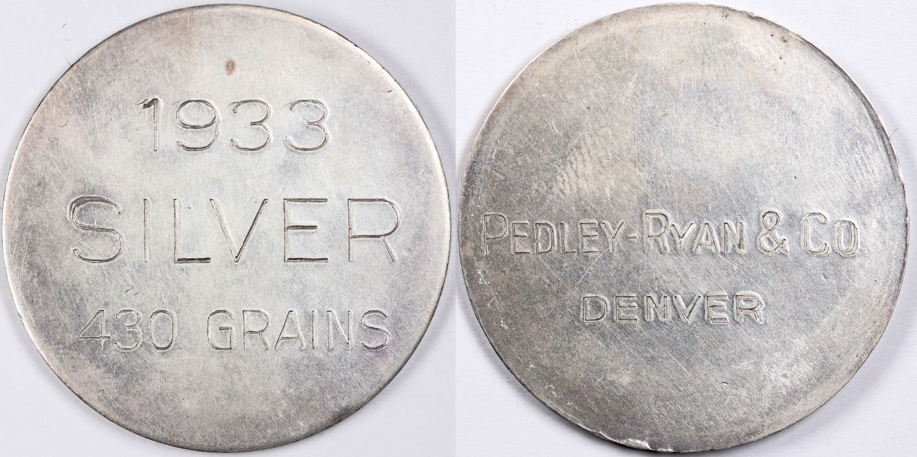 Gem uncirculated Pedley-Ryan & Co. silver dollar, worthy of certification. Obv. Pedley-Ryan & Co. / Denver // Rev. 1933 / Silver / 430 Grains HK-825 Silver. 38mm.