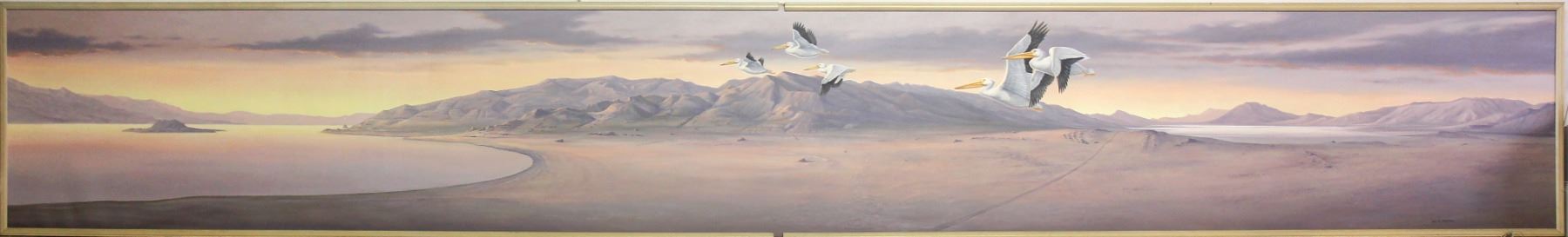Beautiful original oil painting signed by William A. Moore as a gift to Mary & Moe commemorating the expansion of their "Wigwam Restaurant in Fernley Nevada". Pelicans "Going Home" is from Winnemucca Lake to Pyramid Lake. The shores of the once-productive lake were home to tribes that produced the earliest documented petroglyphs (http://news.nationalgeographic.com/news/2013/08/130815-Lake Winnemucca petroglyphs-ancient-rock-art-Nevada/) in the Americas (Benson et al. 2013). It is likely that the extent of Lake Winnemucca varied with fluctuations in climate, forcing tribes to periodically move to more permanent sites such as Pyramid Lake. Their modern-day descendants, the Paiutes, enjoyed the region until encounters with the U.S. cavalry and white settlers became increasingly unpleasant and eventually violent. Part of this sad history was documented by Sarah Winnemucca, daughter of Chief Winnemucca and granddaughter of Chief Truckee (Hopkins 1883). (By Joseph Eilers and Sandra Walker.) This painting will take a large room. It is 16 feet in length and 30" tall. It has light wood frame. An original work of art. Moe & Mary Royels Wigwam Collection