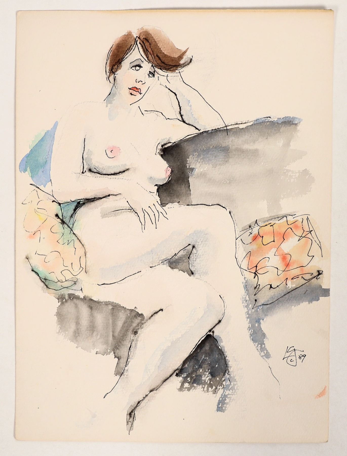1989 original pen and watercolor nude by Leo Glueckselig, Vienna, 1914-2003. 15x11".