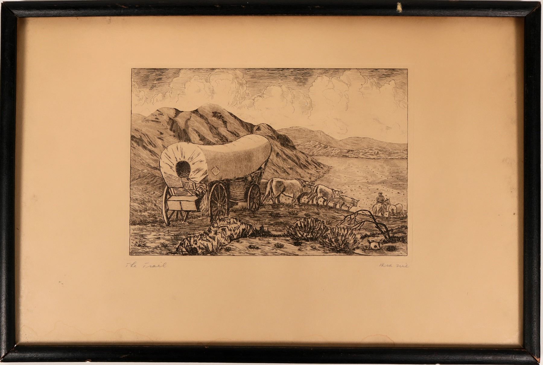 Pencil-signed etching entitled "The Trail." Signed by the artist but the name is illegible to us. (possibly Ria Zoe?). Image is 4.5 x 6.5" in 8.5 x 12.5" frame. Possibly 1920s-30s. Very fine detailed view of Conestoga wagon moving across desert terrain, possibly Nevada.