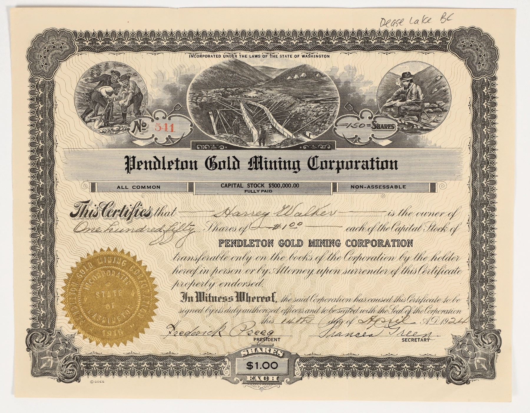 Mining property at Dease Lake, British Columbia. Inc. in Washington. NO 54 ,issued for 150 shares to Harry Walker in 1924. Signed by president Frederick Preeg an secretary Frances Green. Not cancelled. Black border and print, gold seal, and three mining vignettes. Folds, clean.