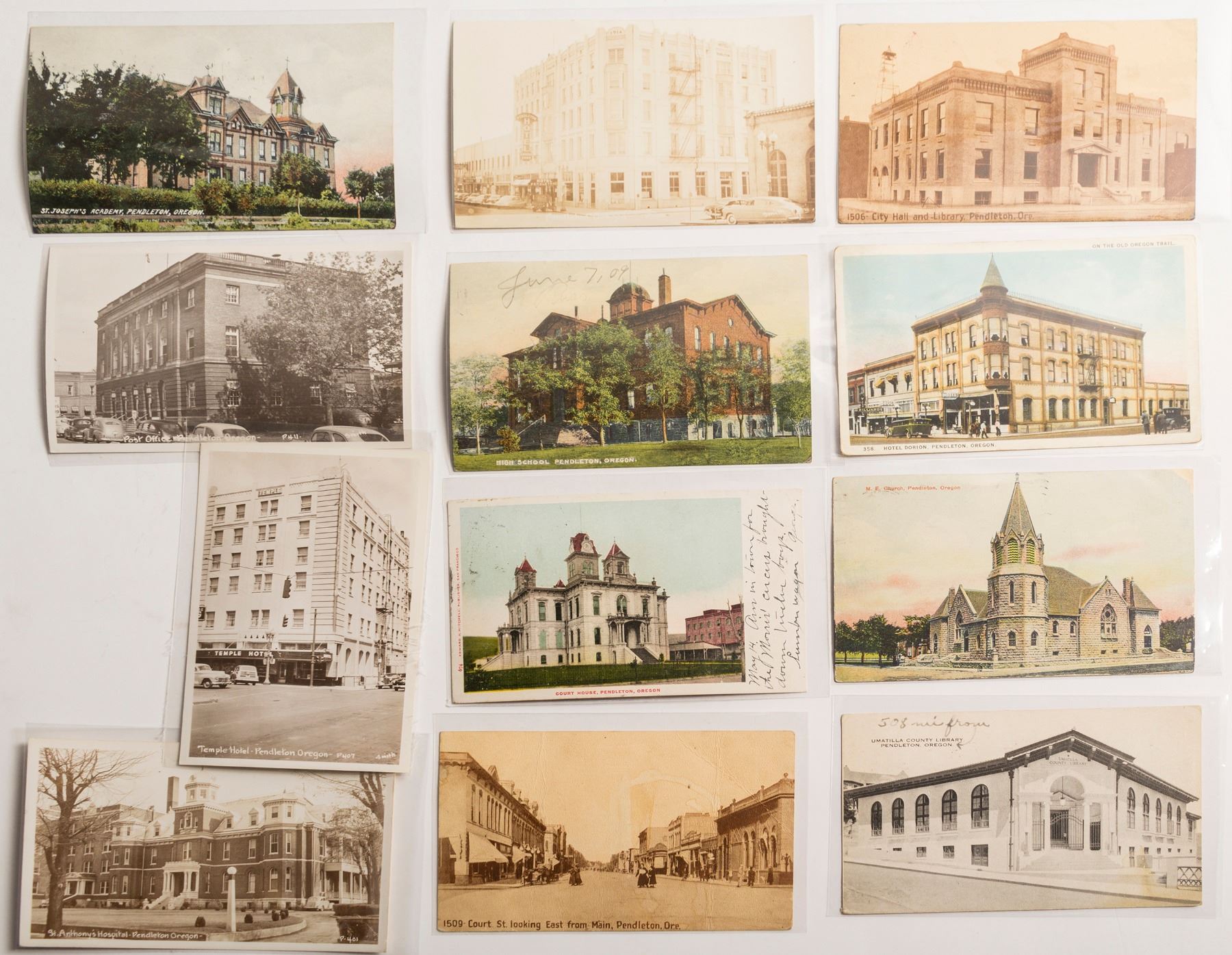 Postcards are dated from 1906 to 1928. Four RPC's: St Anthony's Hospital, Pendleton Hotel (Smith), Temple Hotel (Smith) and Post Office (Smith) . Other buildings include City Hall, high school, court house, Methodist Church, St. Joseph's Academy, Hotel Dorion, and Umatilla County Library.