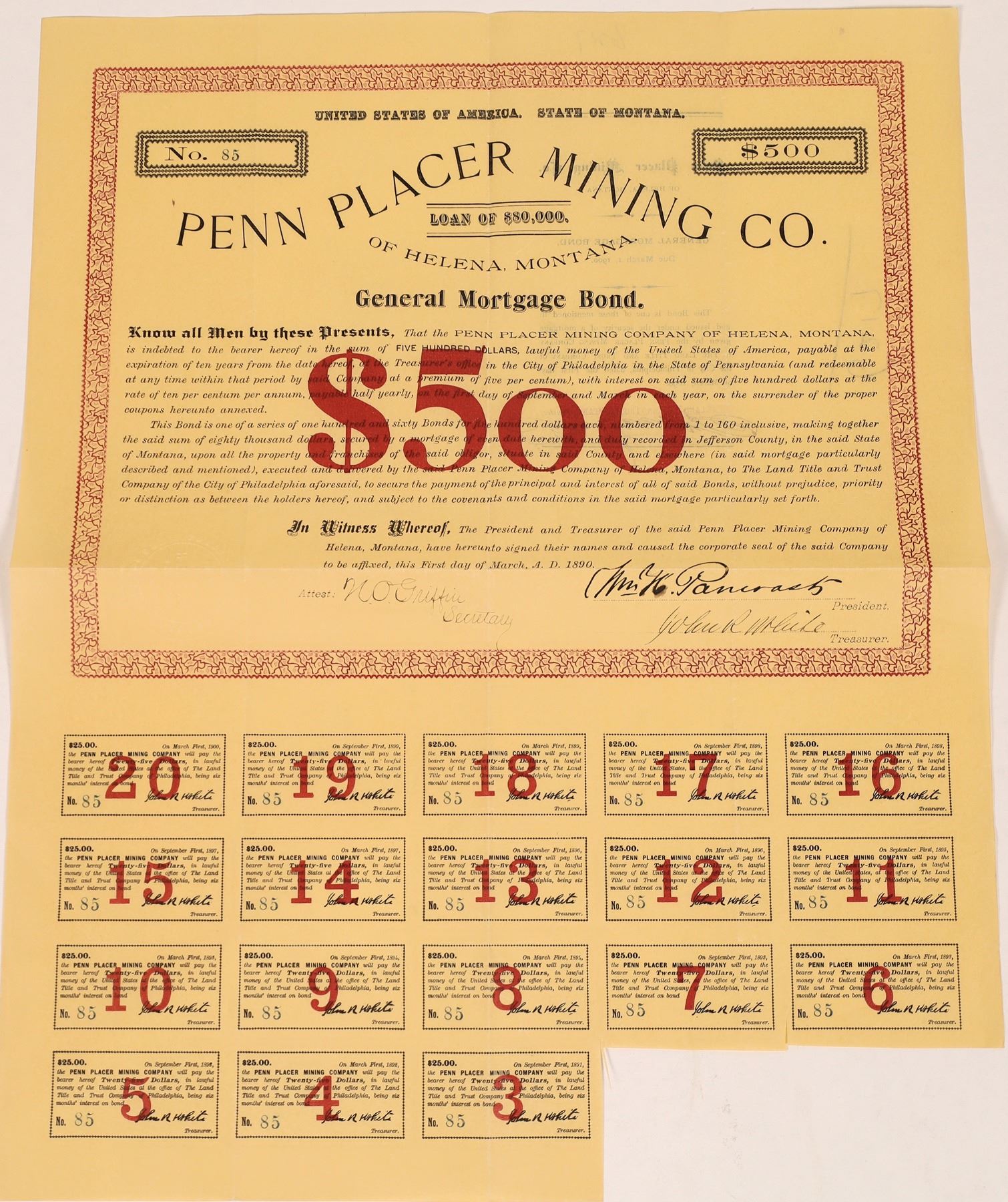 Number 85 signed by president William Pancoush, secretary NO Griffin and treasurer John R. White. Coupons 3-20 attached. Outside of folds, extremely nice. 18 x 14.5". Large and attractive! Nevada 1890 Stuart Mackenzie Montana Mining Collection