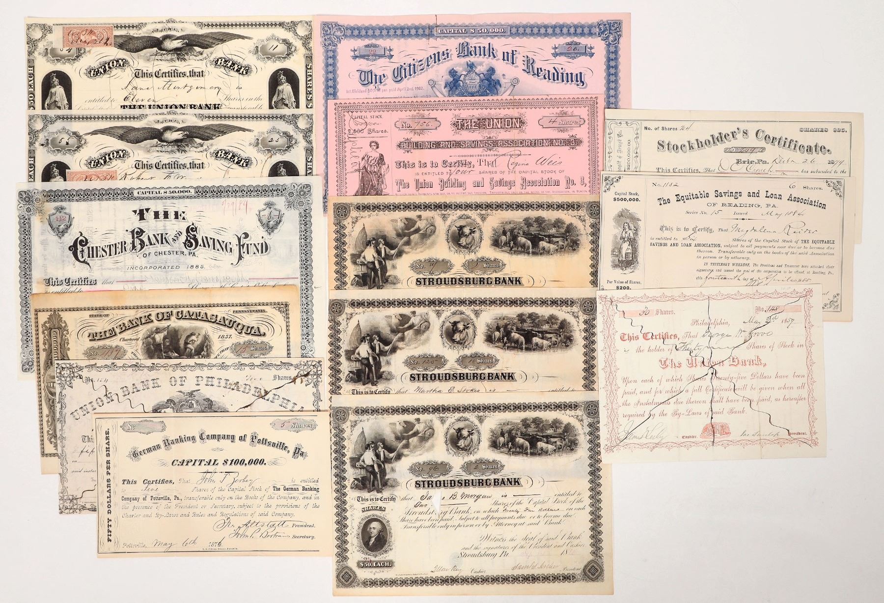 Issued-1886 Chester Bank and Saving Fund, 1885 Equitable Savings and Loan of Reading, 1879 Humboldt Safe Deposit and Trust, 1872 German Banking of Pottsville, 1890 Union Building and Savings, 1888 Citizens Bank of Reading, 1862 Bank of Catasauqua, 3x 1850's-60's Stroudsburg Bank, 2x 1863 Union Bank, 1858 Union Bank of Philadelphia, 1859 Union Bank. Unissued Dime Savings of Bethlehem.