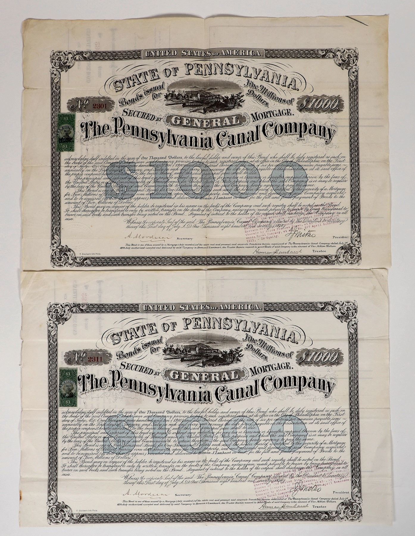 2x 1870 $1000 Pennsylvania Canal Bonds with green 1 dollar adhesive revenue stamps. The Pennsylvania Canal was a complex system of transportation infrastructure improvements including canals, dams, locks, tow paths, aqueducts, and viaducts. The Canal and Works were constructed and assembled over several decades beginning in 1824. Folded and creases.