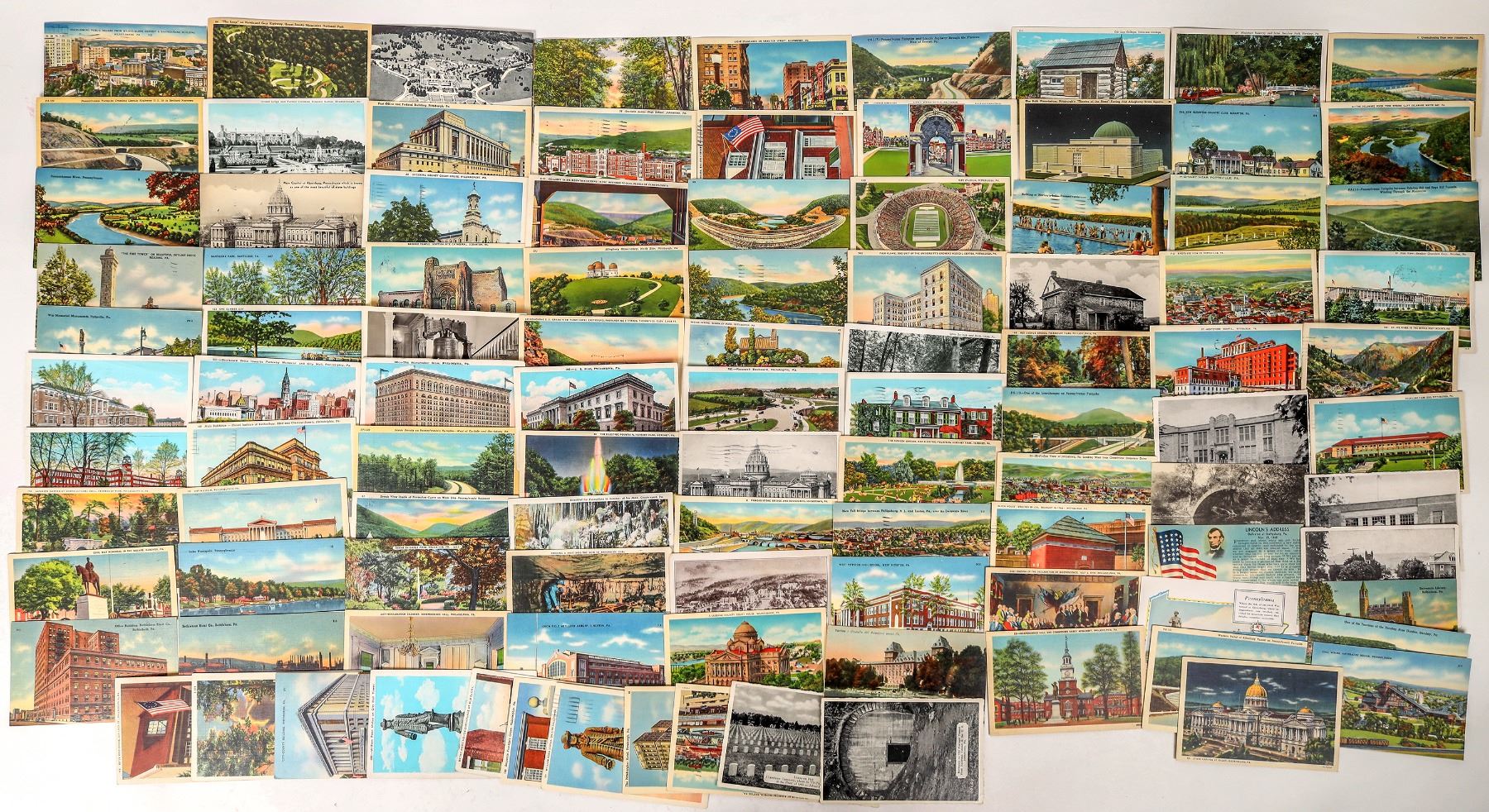 Lot of Approx. 100. Mostly linen era post cards, many by Curt Teich & Co., Sanders Art Series Liberty Bell Logo (five).wht or color borders, some borderless. Postmark IE; Wilkes-Barre, Cleveland Oh., Mount Joy, Jacksonville Ill., North Chicago, Ill., Weissport PA., Pittsburgh, Canonsburg PA., . Street level view i.e; Entrance to Old Portage tunnel first railroad tunnel in U.S. (B/W, wht border), Hershey Rose Garden, Grandview Cemetery 779 unidentified 1889 flood victims, Independence Hall, Coal Mining Anthracite Region, Gov't Bldg's, Schools, Liberty Bell, Daniel Boone's HomeSigning of Declaration of Independence, Main St, Meyersdale PA.Parks and Gardens, bridges. Birdseye view : The Loop Newfound Gap Highway, Public Square Wilkes-Barre, Masonic Home Formal Gardens Elizabethtown, Business section of Easton PA. Many more of each view level. Pennsylvania 1930-50s Ken Prag Collection